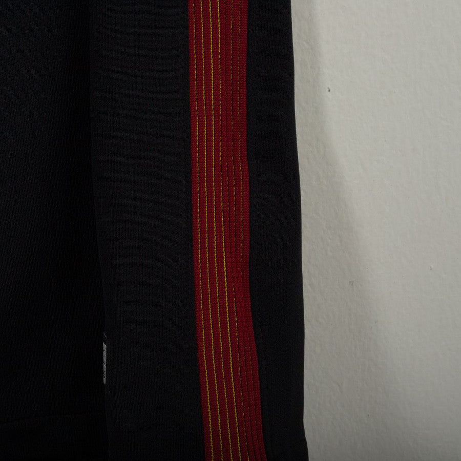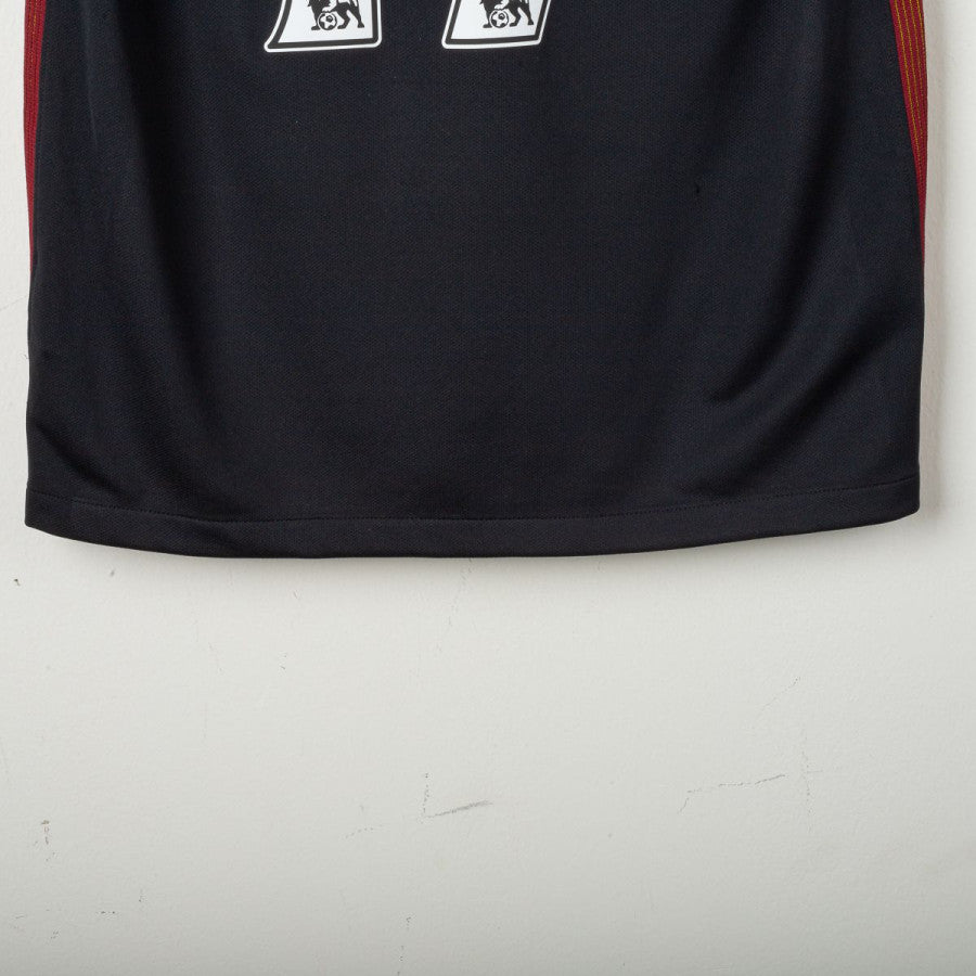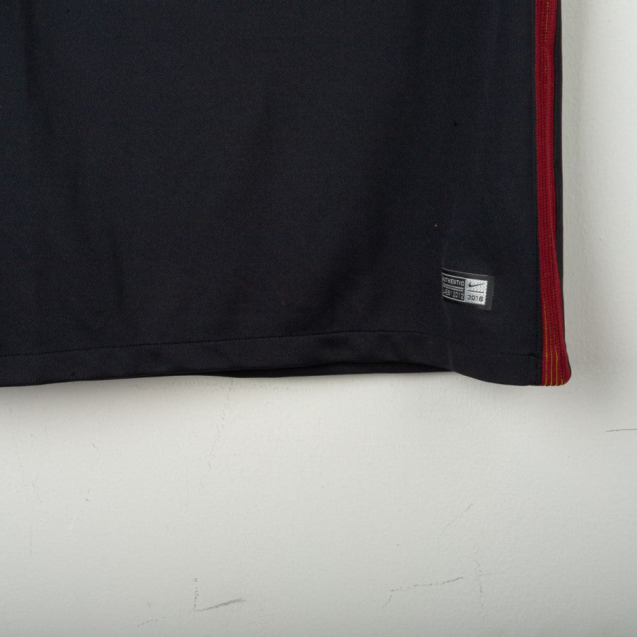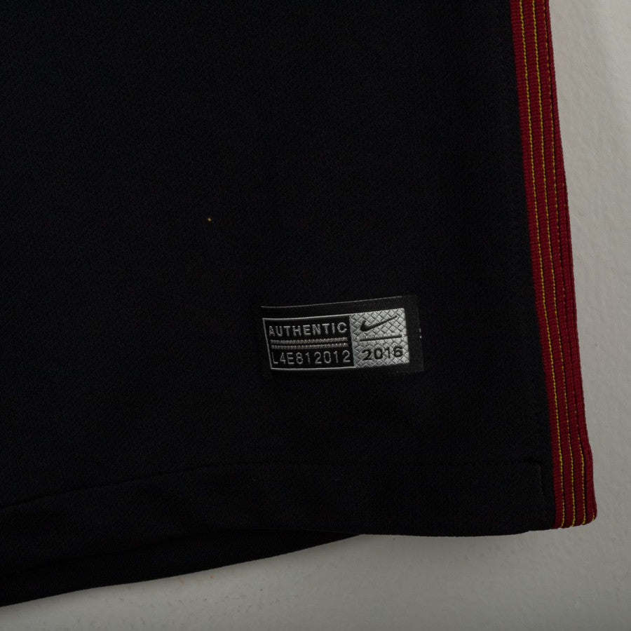 Manchester City away shirt from the 2016/2017 season, made by Nike. Black with burgundy sleeves and yellow details. Etihad Airways sponsor and Nike logo applied. Manchester City crest applied on the chest. "De Bruyne" and number 17 on the back in official Premier League style. Slim fit, size S. Made in Indonesia.