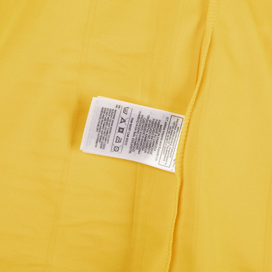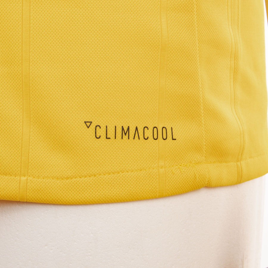 Yellow short-sleeved away model with blue inserts. The shirt has a blue crew neck and a fabric insert generating a V-neck effect. Three blue stripes along the shoulders dialogue with the previous inserts and those on the sleeve edges. The logo of the commercial sponsor Jeep is applied in the centre, while the Juventus crest is embroidered in blue on the heart side. The tricolor shield is sewn on the sternum, the Adidas logo is embroidered on the right, the Italian Cup cockade sewn above it. On the back, the Mandzukic 17 personalization in blue