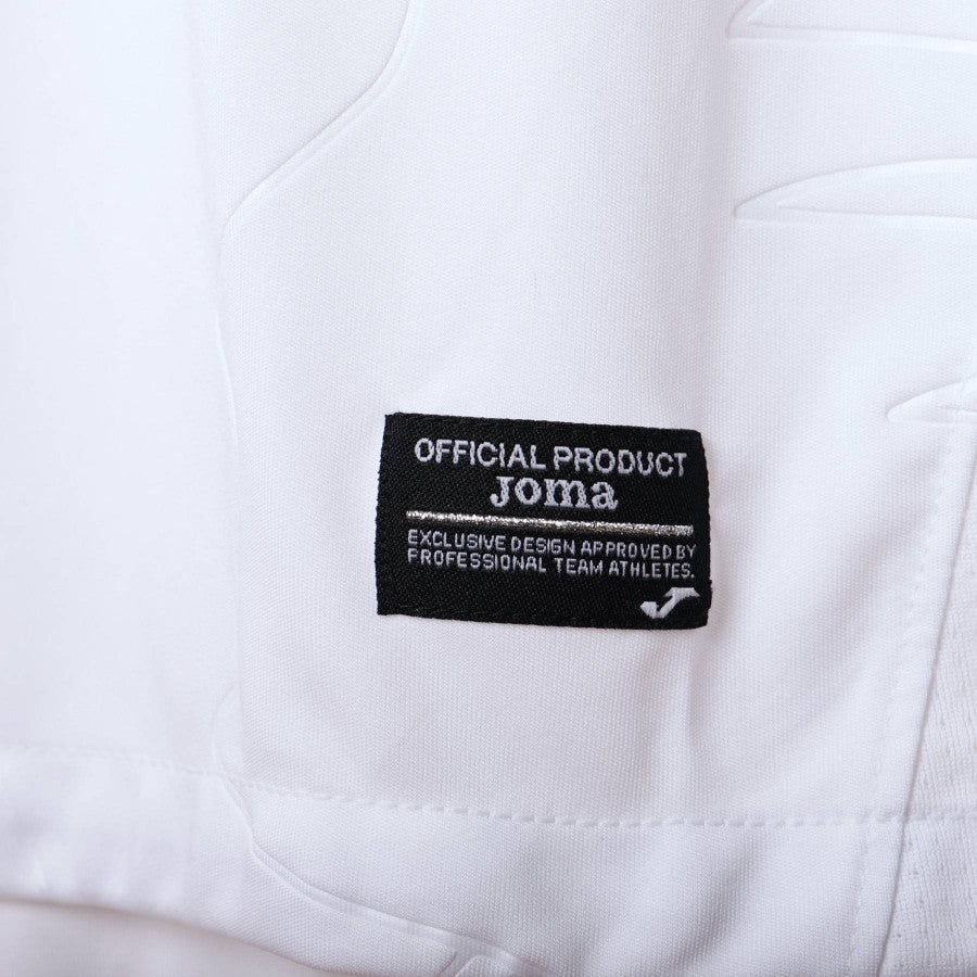 Atalanta away jersey with short sleeves in white with blue and black details on the neckline and on the sleeve edges. On the front there is the team logo embroidered in the center while the logo of technical sponsor Joma is embroidered. On the back are applied MANCINI lettering and the number 28. The Serie A patch is applied on the right sleeve. The commercial sponsors are Modus fm and Veratour. Also sewn the label of authenticity Joma.