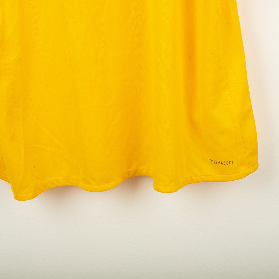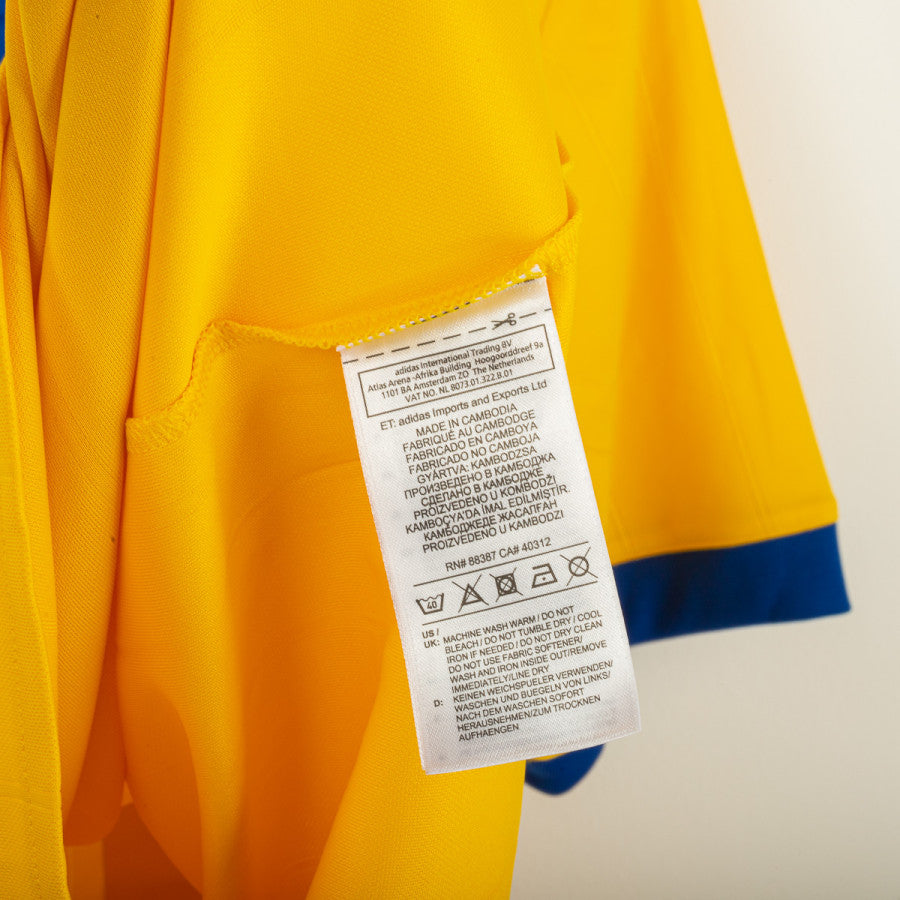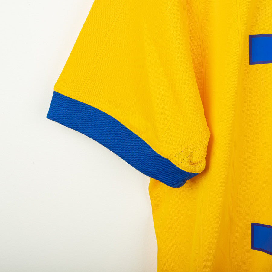 Official Juventus away shirt from the 2017/2018 season, made by Adidas and customized with Dybala 10. Yellow and blue design inspired by Turin’s colors, featuring the embroidered Juventus crest with three stars, Adidas logo, and Jeep sponsor on the front. Includes Scudetto and Coppa Italia patches. Made from ClimaCool breathable fabric for comfort and performance. An iconic shirt from Juventus’ seventh consecutive Serie A title season. Size L.