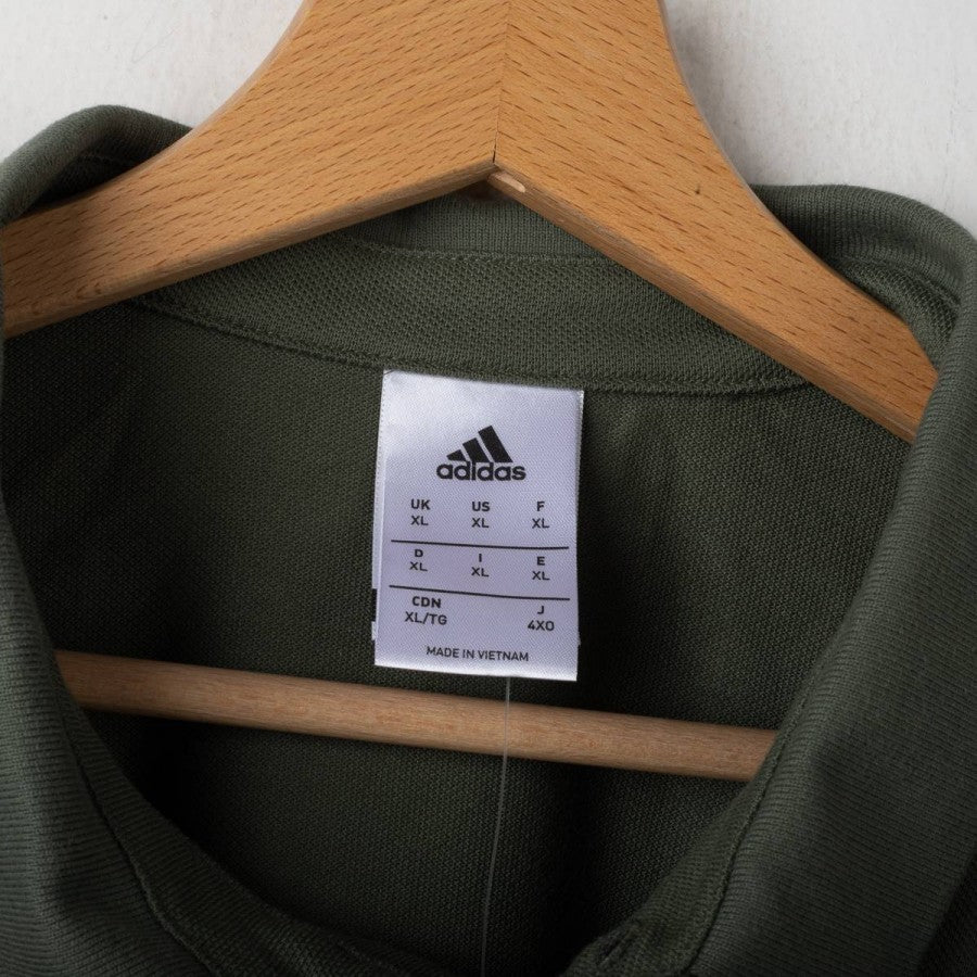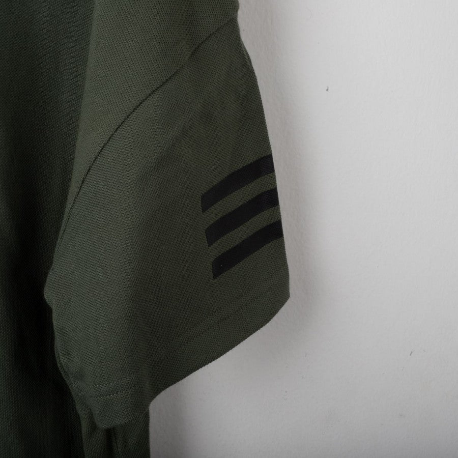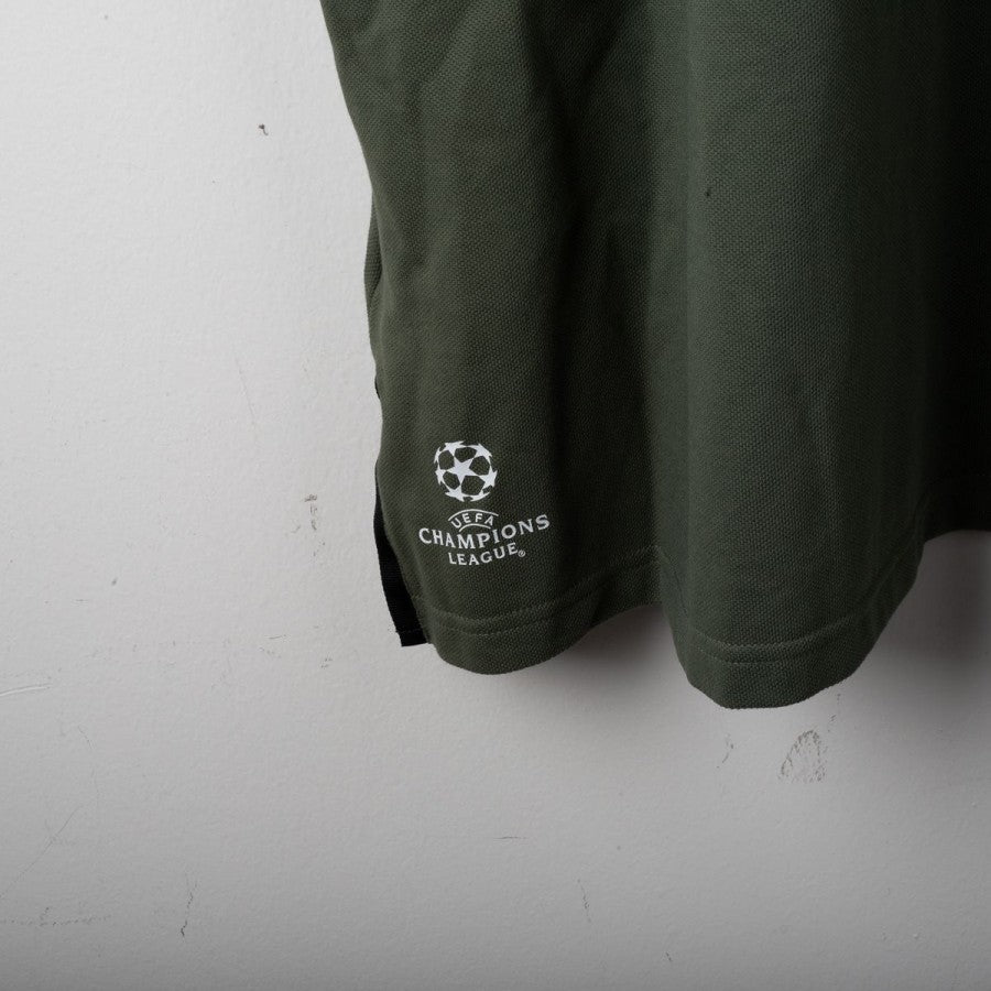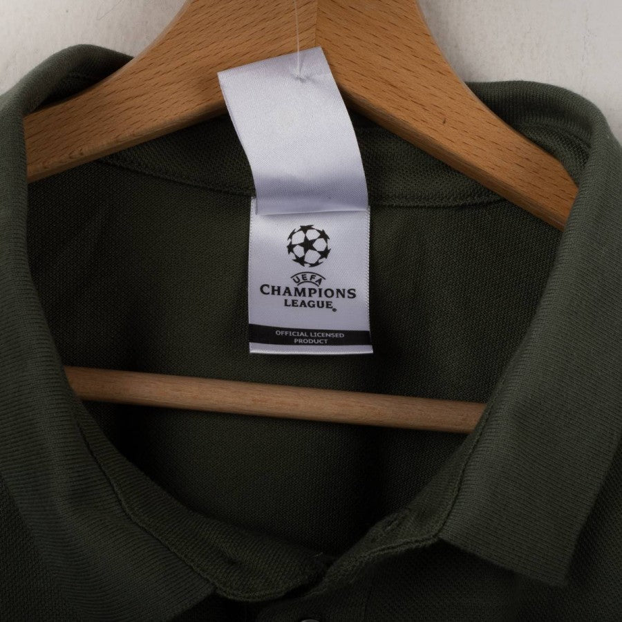 Official Juventus polo shirt from the 2017/2018 season, made by Adidas. Military green with black details, applied Adidas logo and Juventus crest. Number 10 applied below the logo, tonal black stripes on the sleeves and “Champions League” branding on the lower back. Two-button collar. The “0” in the number has two small holes. Size XL.