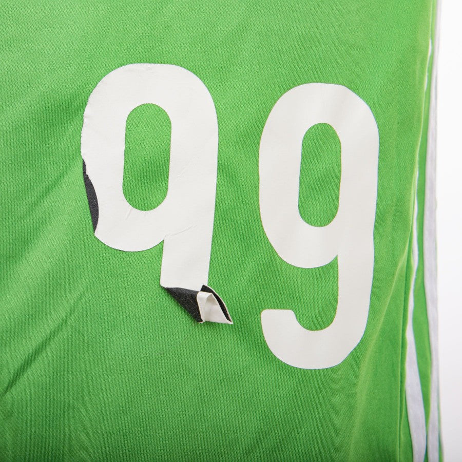 It features a vibrant green design with vertical white stripes down the sides. The club crest is applied to the right side, while the number 99 is personalized to the left. The technical sponsor Adidas is embroidered in white on the back.