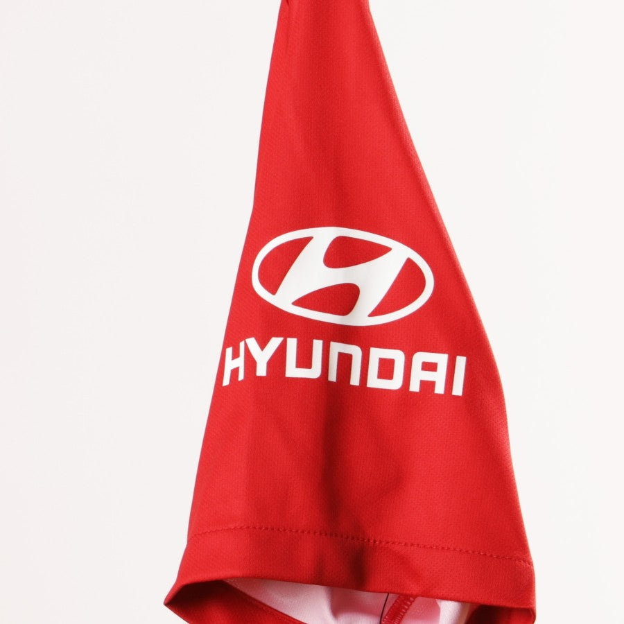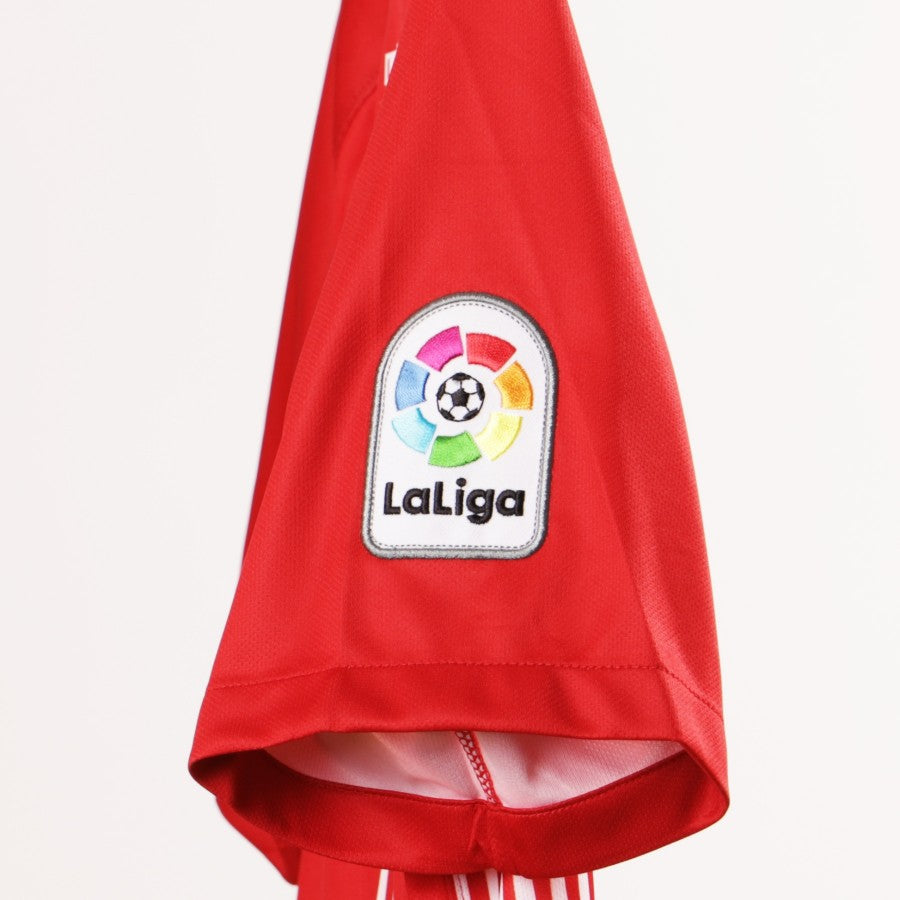 Atletico Madrid home jersey from the 2018/2019 football season. Model with short sleeves, V-neck and red colour. On the front, applied in light plastic, we have the patch of the team on the heart side and the technical sponsor Nike on the right. In the middle is applied the commercial sponsor Trade Plis500. On the back are printed GRIEZMANN lettering and the number 7. On the sleeve is applied the patch of the Liga and on the left is the second commercial sponsor Hiunday.