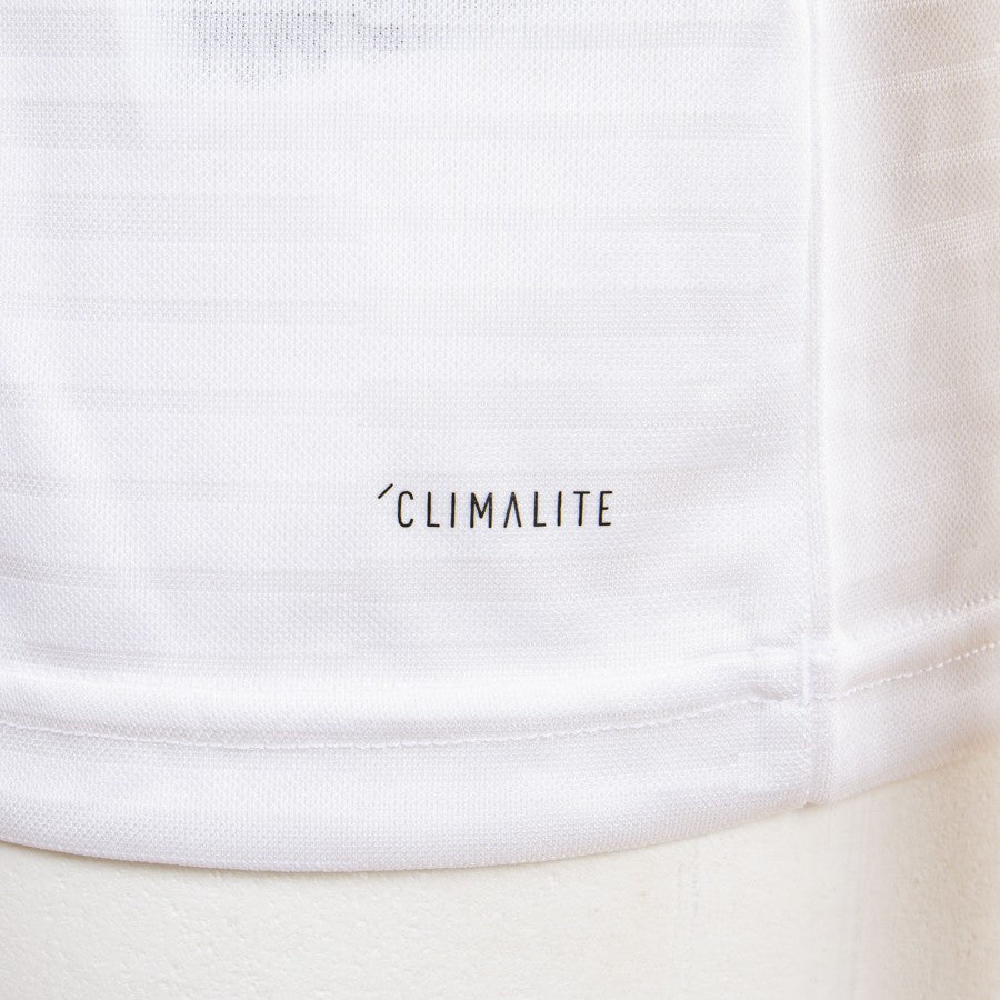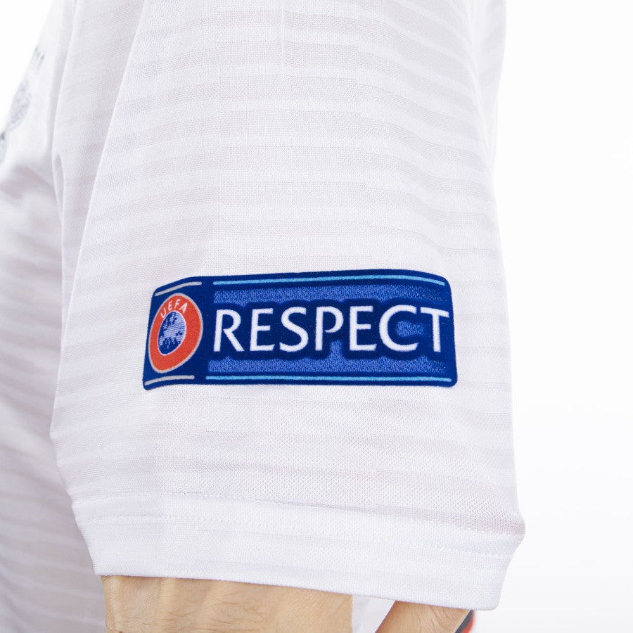 White rope sleeve shirt model with black and red inserts. The black crew-neck is enriched by the presence of the red piping, which recalls the main color of the team. Along the shoulders there are black bands in full adidas style. On the heart side, the company crest surmounted by the eagle and three stars is embroidered, on the right the logo of the technical sponsor Adidas is embroidered in black, the commercial sponsor Fly Emirates is applied in the centre. Champions League patches applied on the sleeves. The Jonas 10 personalization is applied in rubber on the back.