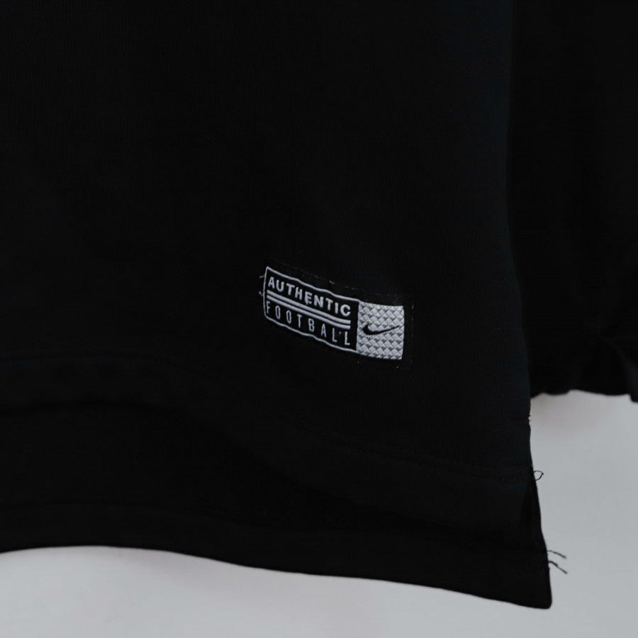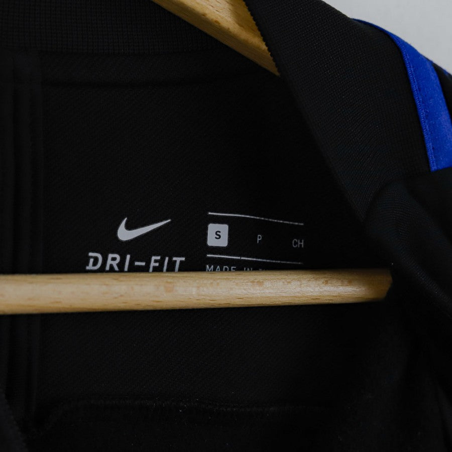 Official Chelsea sweatshirt for the 2017/2018 season, produced by technical sponsor Nike. This black sweatshirt features a modern design with blue details on the shoulders. The chest displays the embroidered Nike logo and Chelsea crest, along with the Carabao sponsor in the center. Equipped with a partial zip, long sleeves, and thumbhole cuffs, this sweatshirt is perfect for training and casual wear. Size S, ideal for Blues fans seeking sporty and functional style.