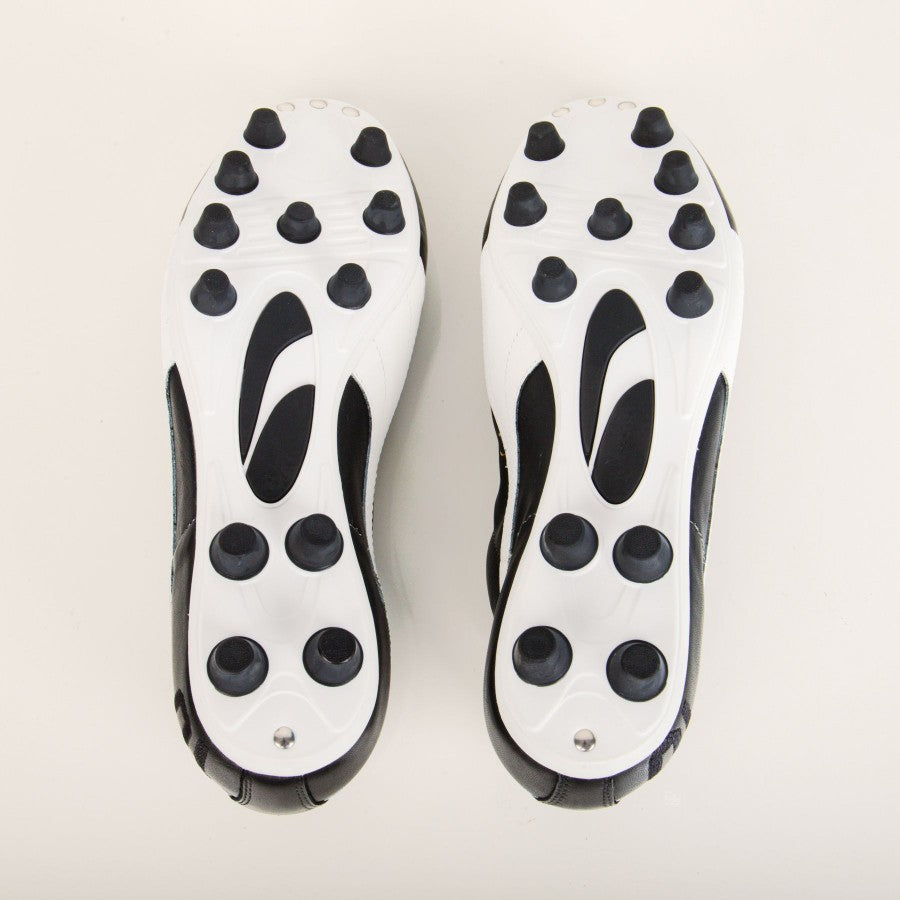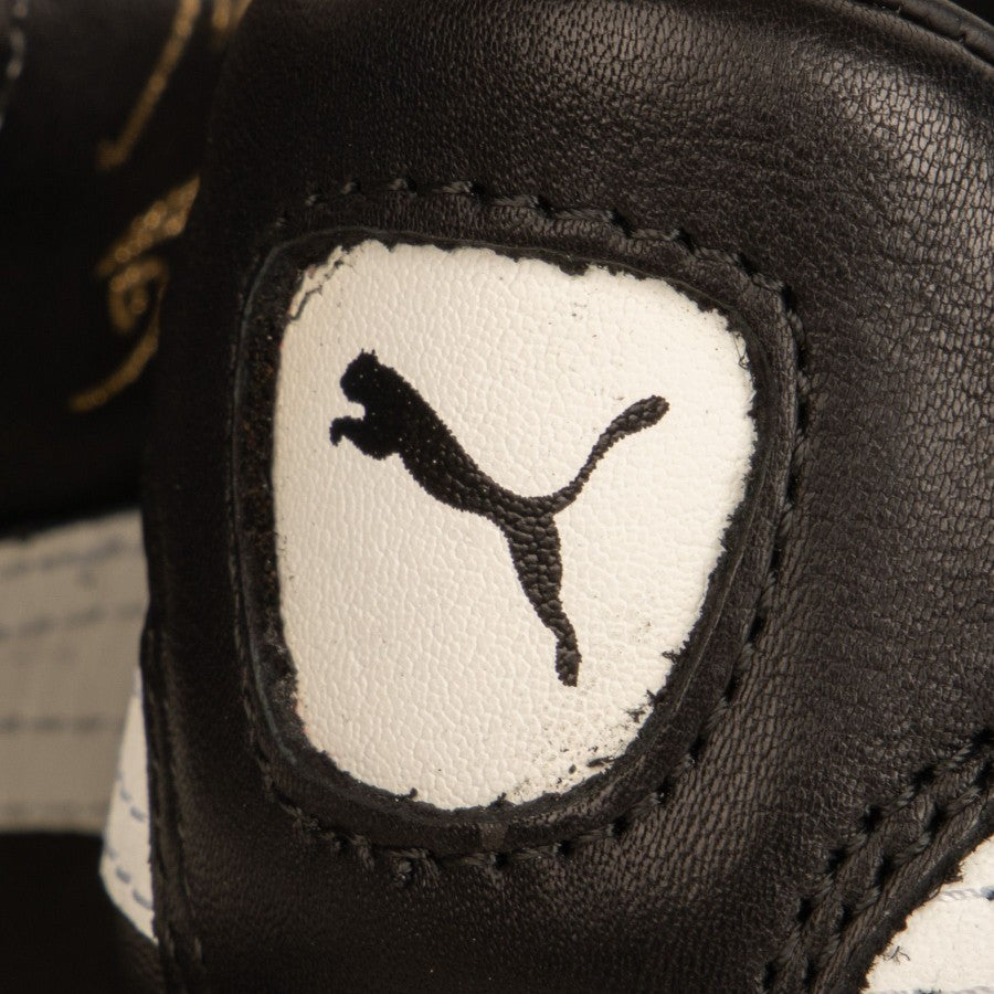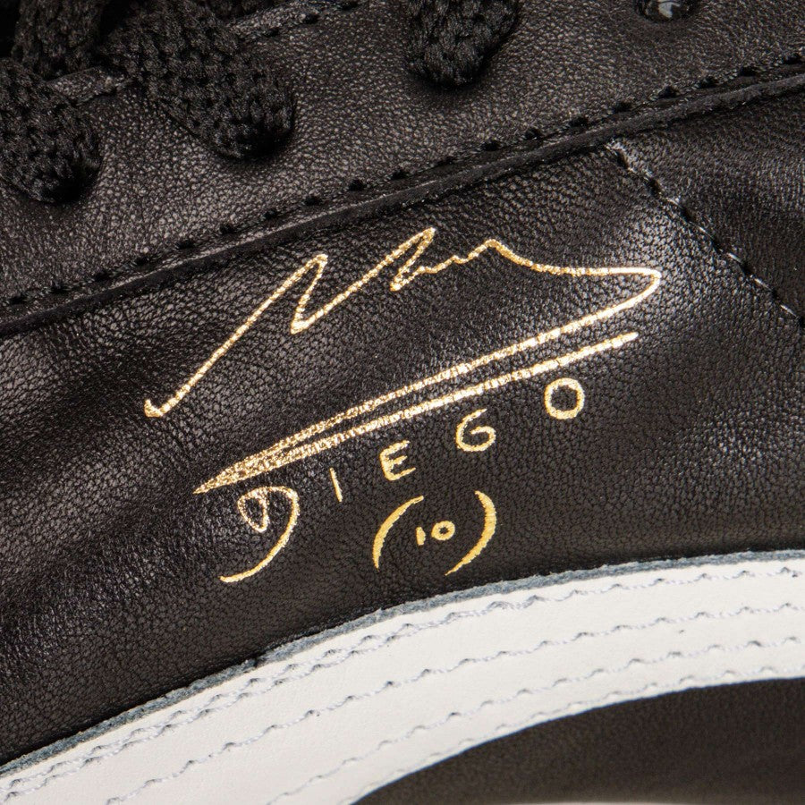 Black model with white and golden inserts. On the right side there is, on one side, the Puma logo with the Maradona - Super lettering, on the other the signature of Diego Armando Maradona in gold print. The number 10 is visible, in tone-on-tone embroidery, on the back side.