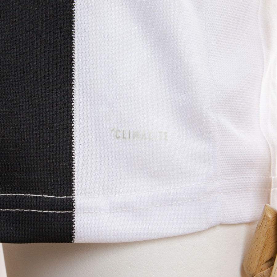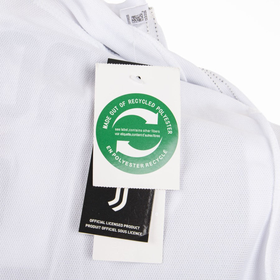 Short-sleeved shirt model is practically solid white, with two large vertical black bands on the front. In the center of the jersey, a horizontal black patch contains the commercial sponsor still Jeep. The collar is entirely white, as are the sleeves. The traditional three Adidas stripes appear on the shoulders. The back is almost completely white, except for a large central black band. The Serie A patch is applied to the right sleeve. On the front, inside the wide black stripes, we find the company logo embroidered on the heart side, surmounted by the three golden stars that symbolize the passing of the 30 national championships won. The logo of the technical sponsor Adidas appears on the black band on the right, above which the cockade of the Coppa Italia is sewn. The tricolor shield is sewn into the wide central white band. The Ronaldo 7 personalization is applied on the back.