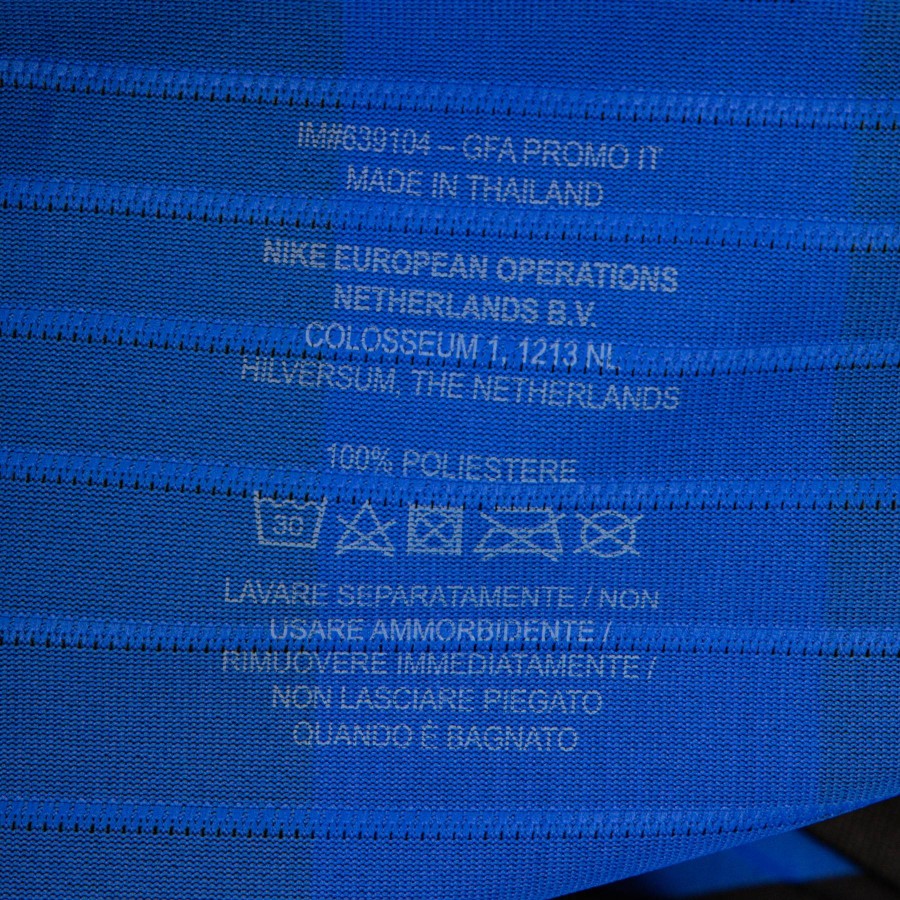 Pattern with black and blue vertical stripes. On the right Nike logo and on the left Inter emblem with a star. Below is the commercial sponsor Pirelli. Serie A Tim patch on the sleeve.