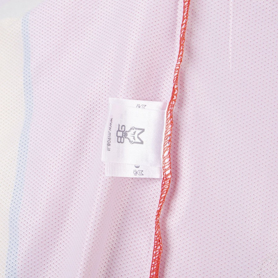 Short-handed home model in traditional yellow-red colours. The shirt is characterized by yellow-red vertical stripes. The crewneck is in blue, like the inserts that fall from the shoulders to the sides. On the front, on the heart side, the emblem of Lecce is finely embroidered, the logo of the technical sponsor M908 is sewn on the right, while the commercial sponsors Maffei and Moby are applied in the centre. The Serie B patch is applied to the right sleeve. The Ricciardi 2 personalization is applied to the back
