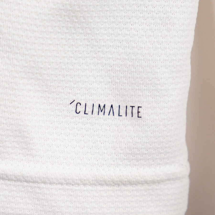 White model with black inserts. On the left the Real Madrid emblem is visible, on the right we find the Adidas logo and the Fifa World Champions 2017 Patch.
