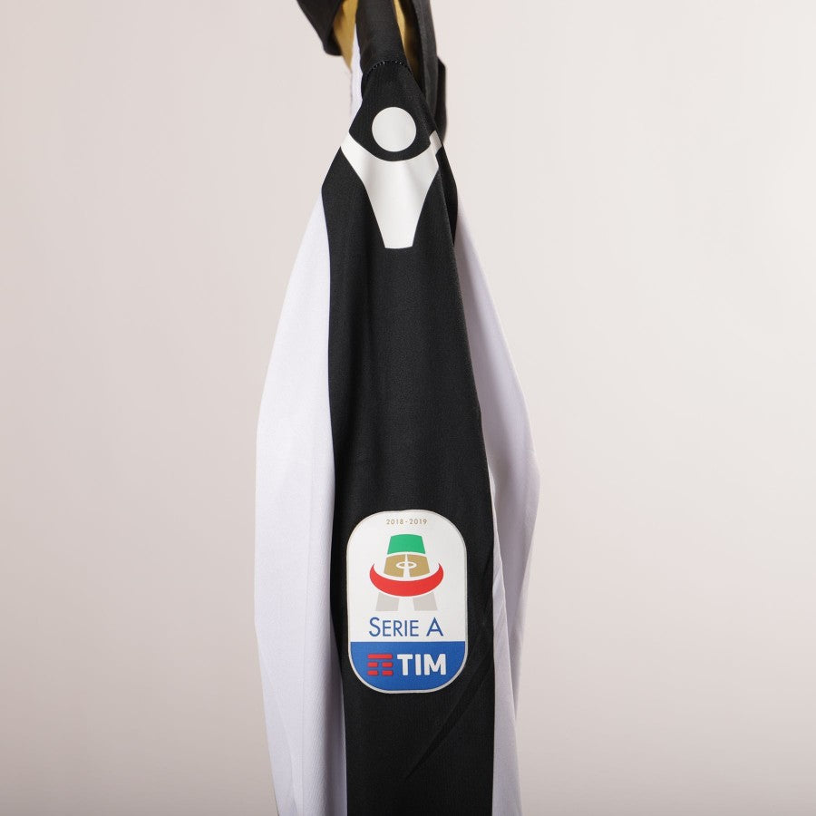 Udinese home jersey, season 2018/2019. Polo model with buttons and long sleeves. On the front are embroidered the patch of the team heart side, and the logo of the technical sponsor Macron on the right. At the center, applied in light plastic, the commercial sponsors Dacia and Vortice. On the back are printed lettering MANDRAGORA and the number 38, in addition to the second commercial sponsor Bluenergy. Finally, the Serie A patch is embroidered on the right sleeve.