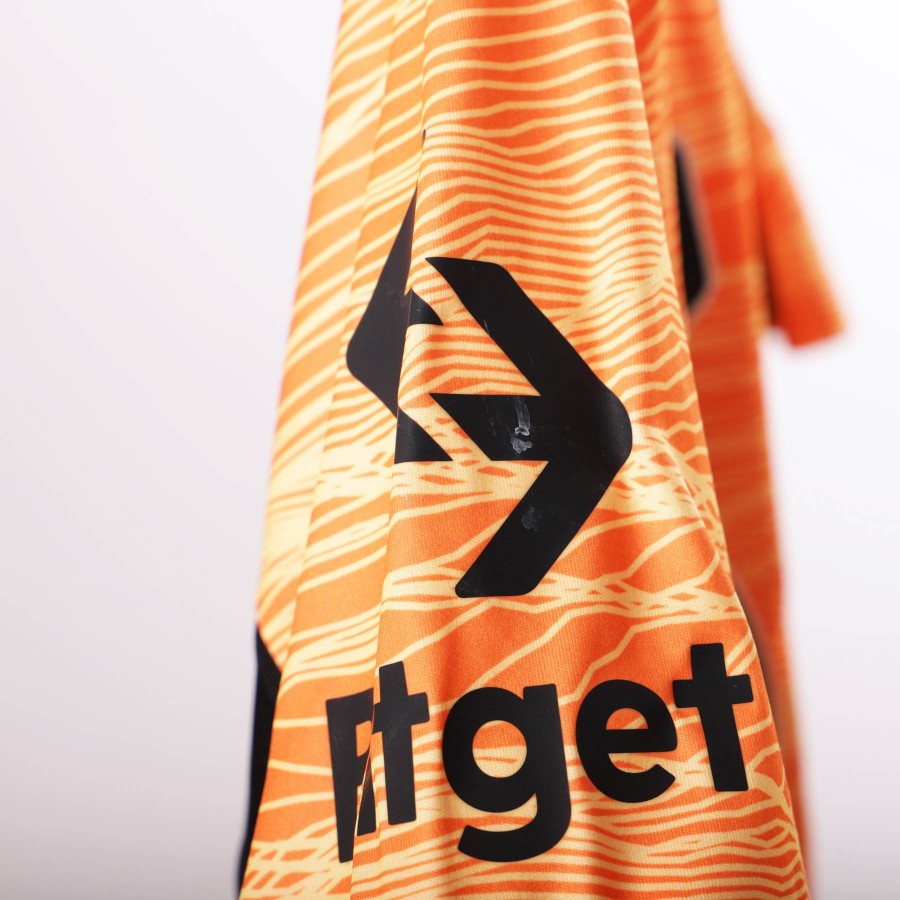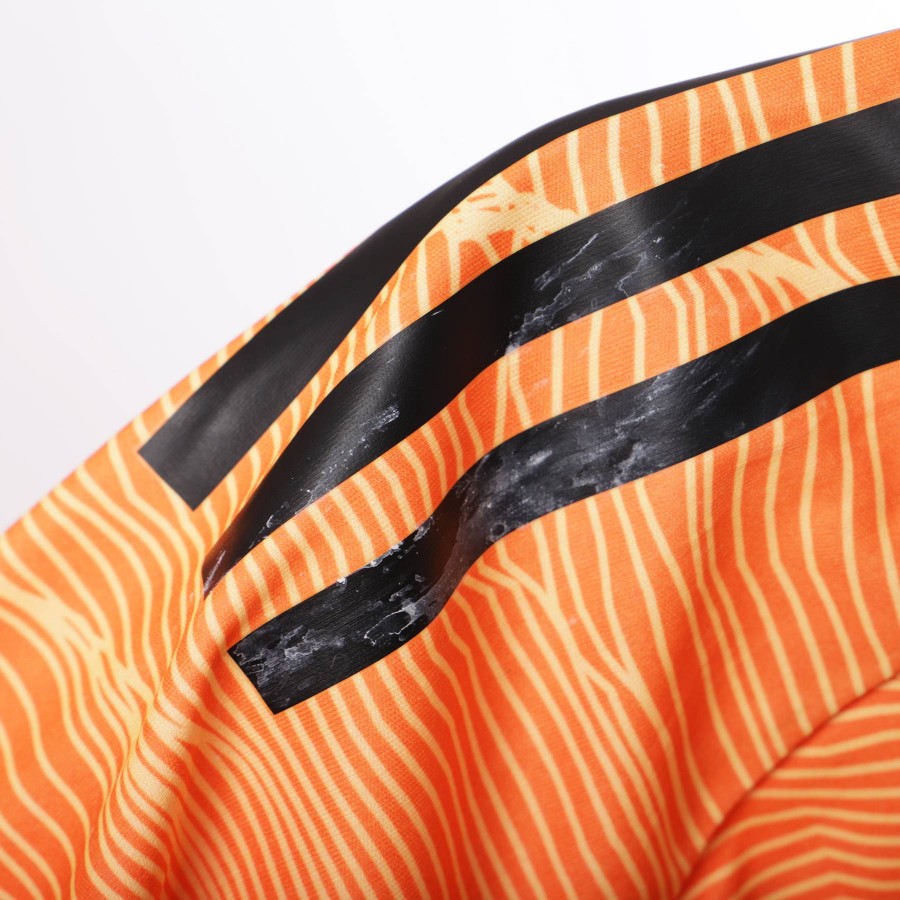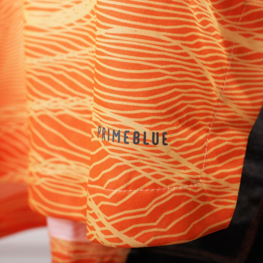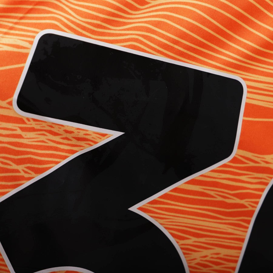 The jersey is in a soft and bright orange with abstract patterns and black inserts.