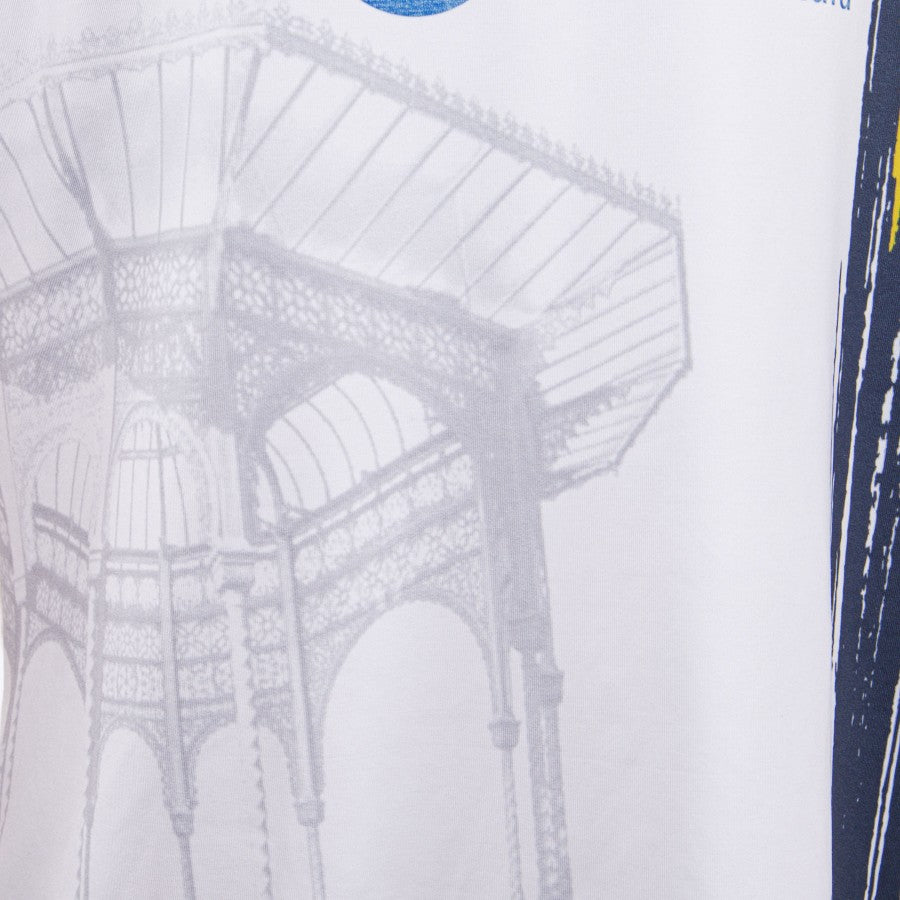 White short-sleeved shirt model. The shirt is characterized by a vertical yellow-blue brushstroke on the right. In the background there is a stylized Armonic Box, symbol of the city of Stabia. The is embellished by the yellow-blue circular collar. The lettering of the technical sponsor Givova is embroidered in blue on the right, while the Juve Stabia club crest is applied to the heart side. At the center are the commercial sponsors Spada and AutoShopping. The Givova logo in blue is embroidered on the sleeves; on the right the Serie B patch. The Germoni 23 personalization and the Optima sponsor on the bottom are applied on the back.