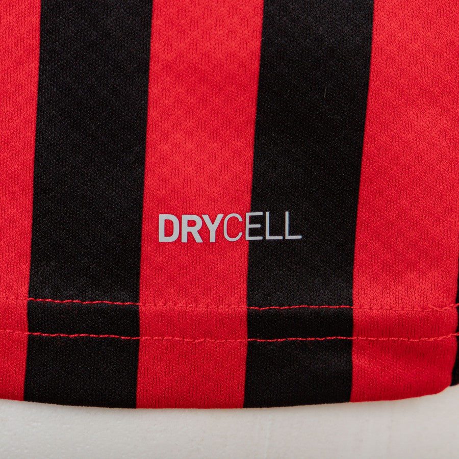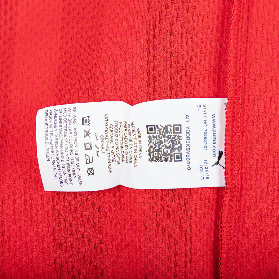 The product can be clearly seen from the many photos relating to it. The shirt has short sleeves and its main colors are the red background and the black of the numerous narrow vertical stripes that cross it; the club logo is applied to the top left, while on the opposite side there is the white one of Puma, technical sponsor; the commercial sponsor, Fly Emirates, is also applied below these elements, also in white.