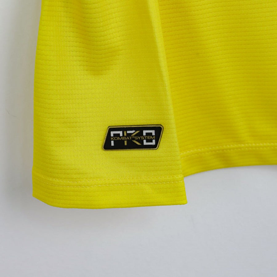 Napoli goalkeeper jersey, special edition created by Kappa in collaboration with designer Marcelo Burlon for the 2020/2021 season. This jersey, number 064 out of a limited series of 200 pieces, features a bold design with blue wings spreading from the shoulders over a bright yellow background. The front showcases the Napoli crest on the left chest, along with the commercial sponsors Lete and MSC in red and blue. The right sleeve carries the Coppa Italia patch, commemorating the team's victory in the previous season. The back is dominated by the large red Kimbo logo. A unique piece for collectors and Napoli supporters.