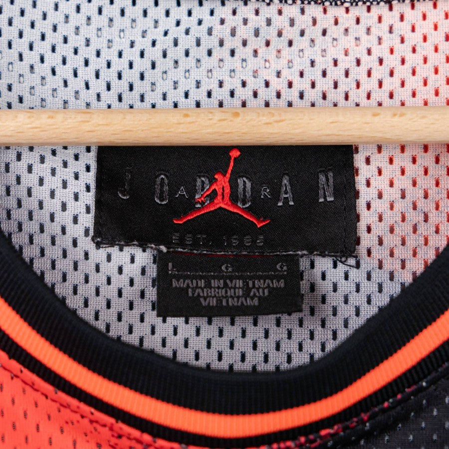 Black model with orange and gray details. The team crest is visible on the heart side, and the Air Jordan logo is visible on the right. The commercial sponsor Paris is visible in the center.