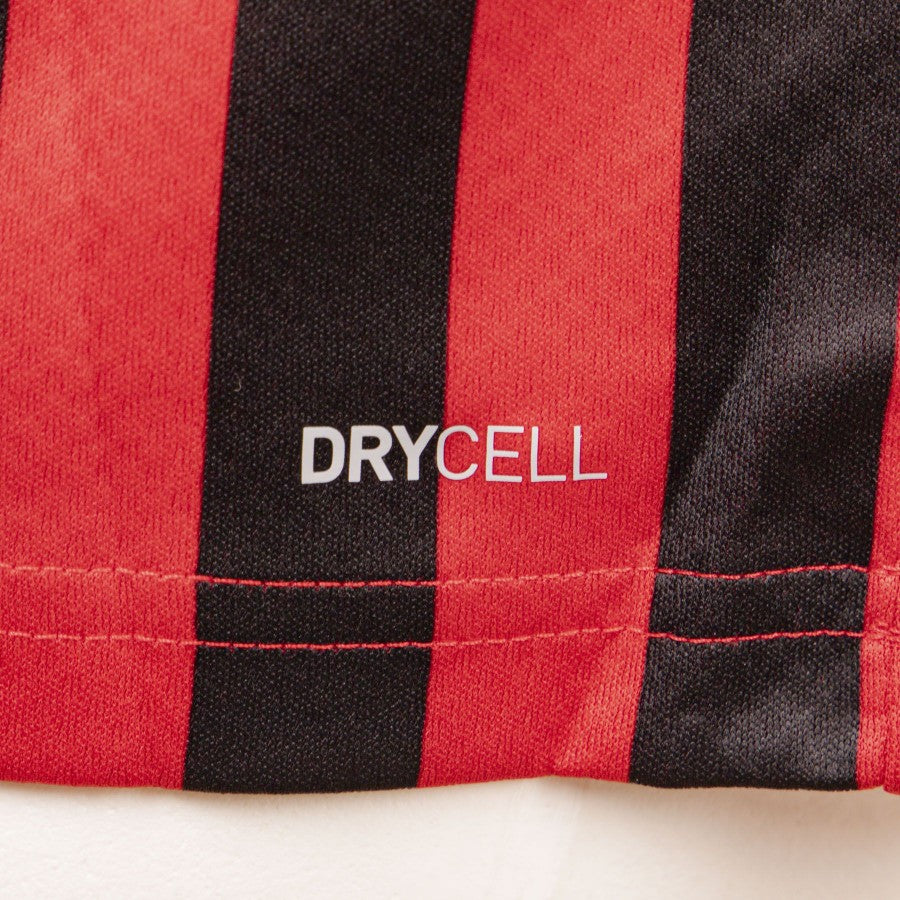 Short-sleeved shirt model characterized by the red and black stripes, in this uniform they are narrower and cover the entire shirt, sleeves and back included. On the chest there is the company crest sewn on the heart side, the Puma logo embroidered on the right and the main sponsor Fly Emirates thermo-applied on the center of the bust. On the back there is the Ibrahimovic 11 personalization