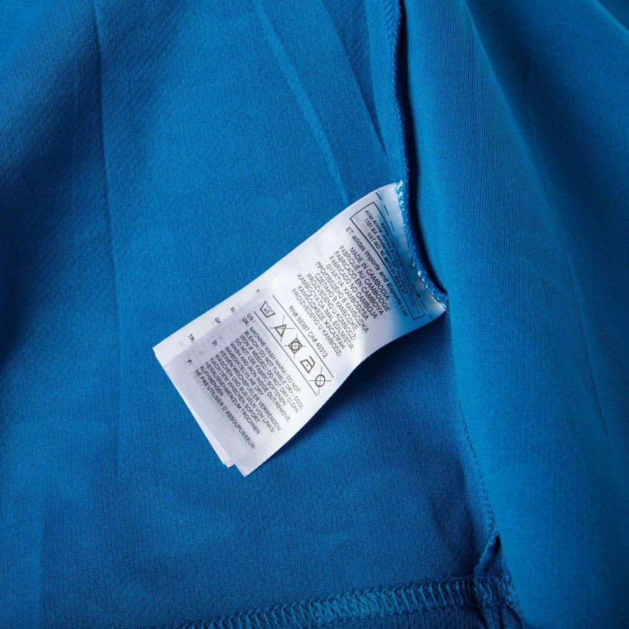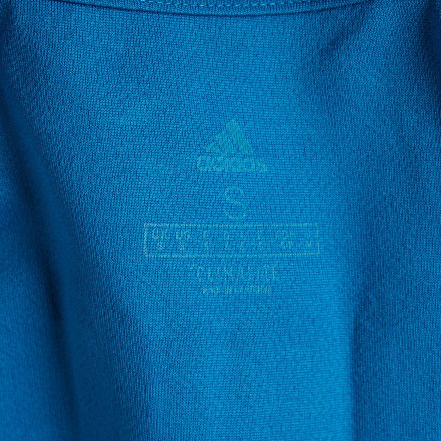 Away model in a teal colour, crew neck and half sleeve. All patches are applied in light plastic, including the logo of technical sponsor Adidas.