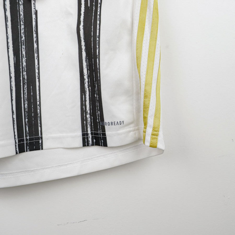 The product can be admired well thanks to various photographic evidence. The shirt has short sleeves and is characterized by a white background crossed by black vertical stripes with a shaded effect; the gold-colored logo of the club is applied to the top left, while on the opposite side we find that of Adidas, technical sponsor, also in gold; below these, the commercial sponsor, Jeep, also in gold, stands out.