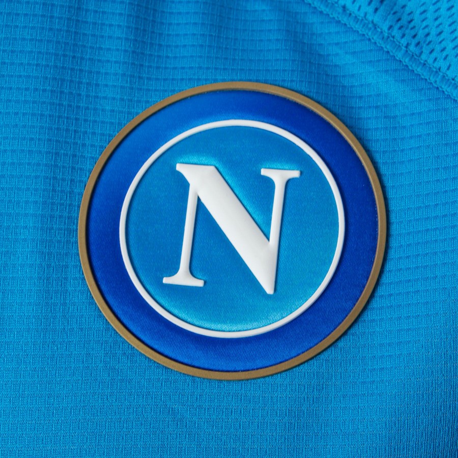 Home model in light blue with gold details. V-neck and short sleeve. On the front is applied the Napoli patch on the heart side and the tricolour cockade in the centre.