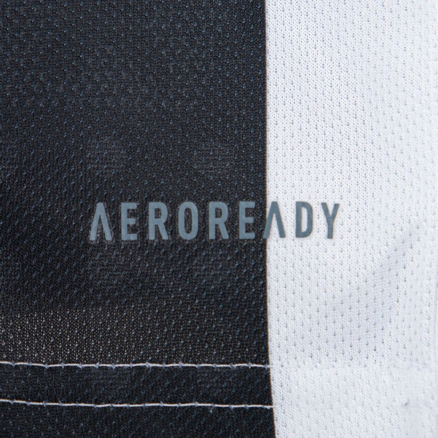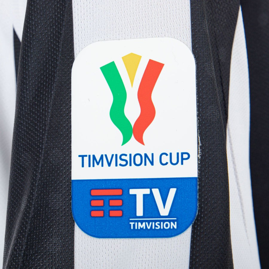 The product can be well admired from the many photos. The shirt has short sleeves and its main colors are the white background and the black of the narrow vertical stripes that cross it; the club logo is applied to the top left, while on the opposite side there are the tricolor cockade and the white logo of Adidas, technical sponsor; below these elements, the black wording of the Jeep commercial sponsor appears, followed by another, 4xe, in blue.