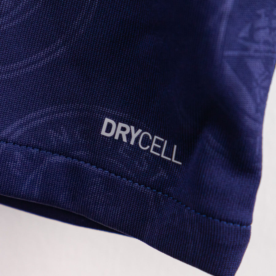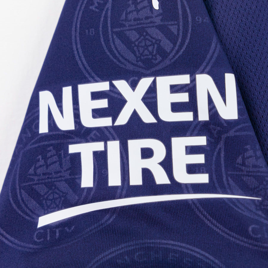 Navy blue uniform. In the center you can find the Puma logo, the MAN CITY lettering between two horizontal lines and the commercial sponsor Etihad Airways. On the sleeves there is the Chamions League and UEFA Foundation for Children patch, with sponsor Nexen Tire.