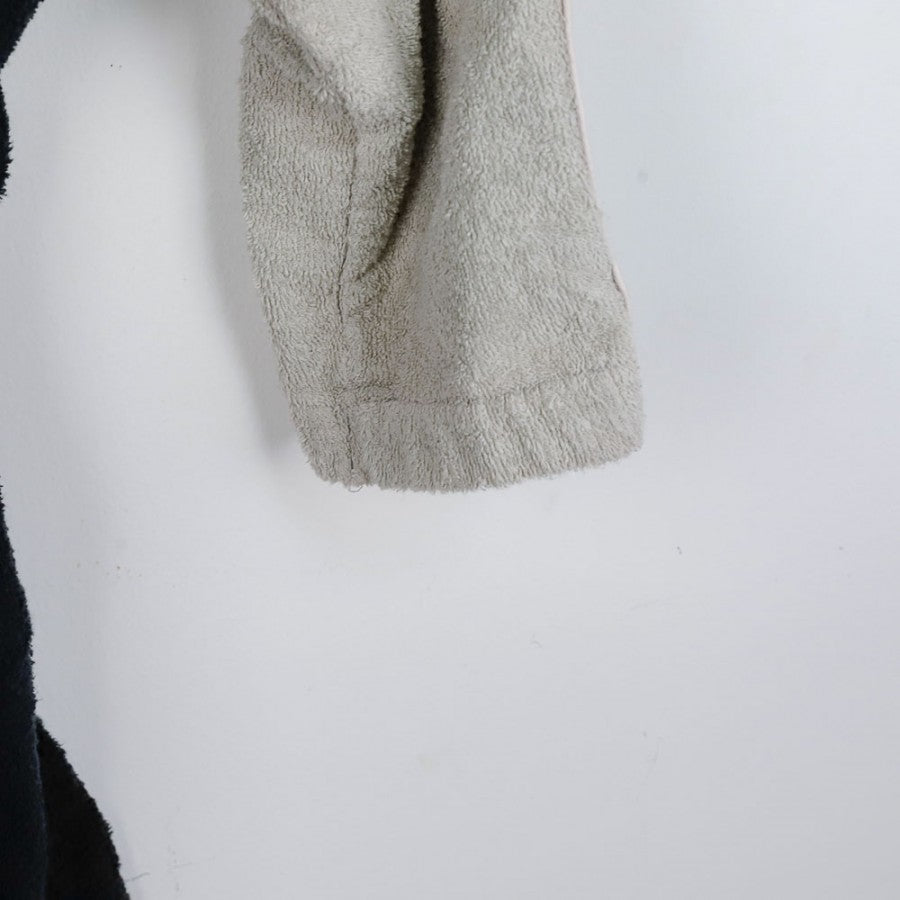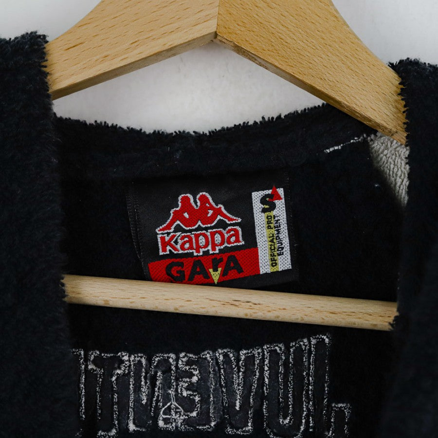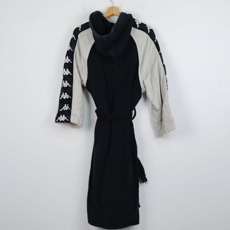 Official Juventus bathrobe from the 1998/1999 season, produced by technical sponsor Kappa. This black bathrobe features grey sleeves with the iconic Kappa bands running along the shoulders, displaying the repeated logo in white. The Juventus crest is embroidered on the chest, featuring two stars symbolizing the club’s numerous championship victories. The Kappa logo is also stitched on the left side. Made from soft and absorbent terry cloth, this bathrobe is perfect for Juventus fans who want to showcase their pride even off the field.