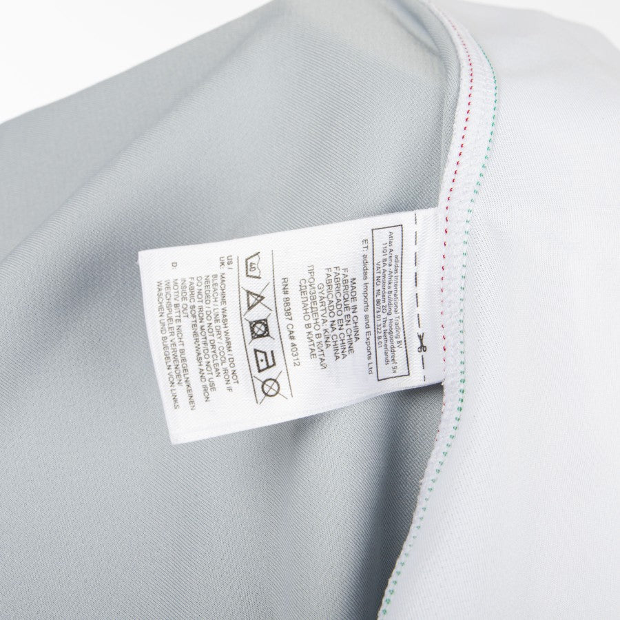 Tank top model used by the Rossoneri players during training sessions. The tank top is presented in comfortable and breathable fabric, on the front in white, while on the back it is gray. Present ergonomic gray crewneck, from which three gold stripes extend on both shoulders. In the center of the chest, the logo of the technical sponsor Adidas is sublimated, lower down the commercial one is Fly Emirates. On the heart side, the AC Milan club crest. While on the back, between the shoulder blades, we find the adidas logo applied.