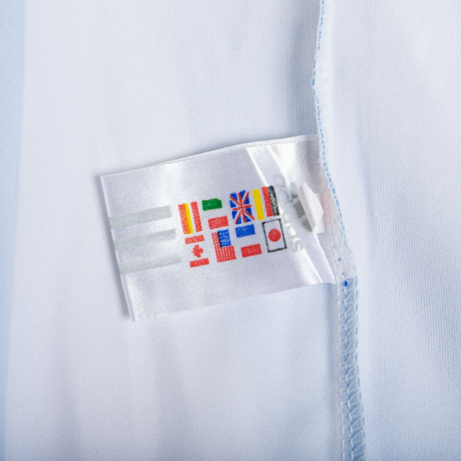 Home Jersey of the Argentina National Team with short sleeves. On the front are embroidered the logos of Adidas and the Argentine Federation, on the back neck is printed the lettering ARGENTINA.