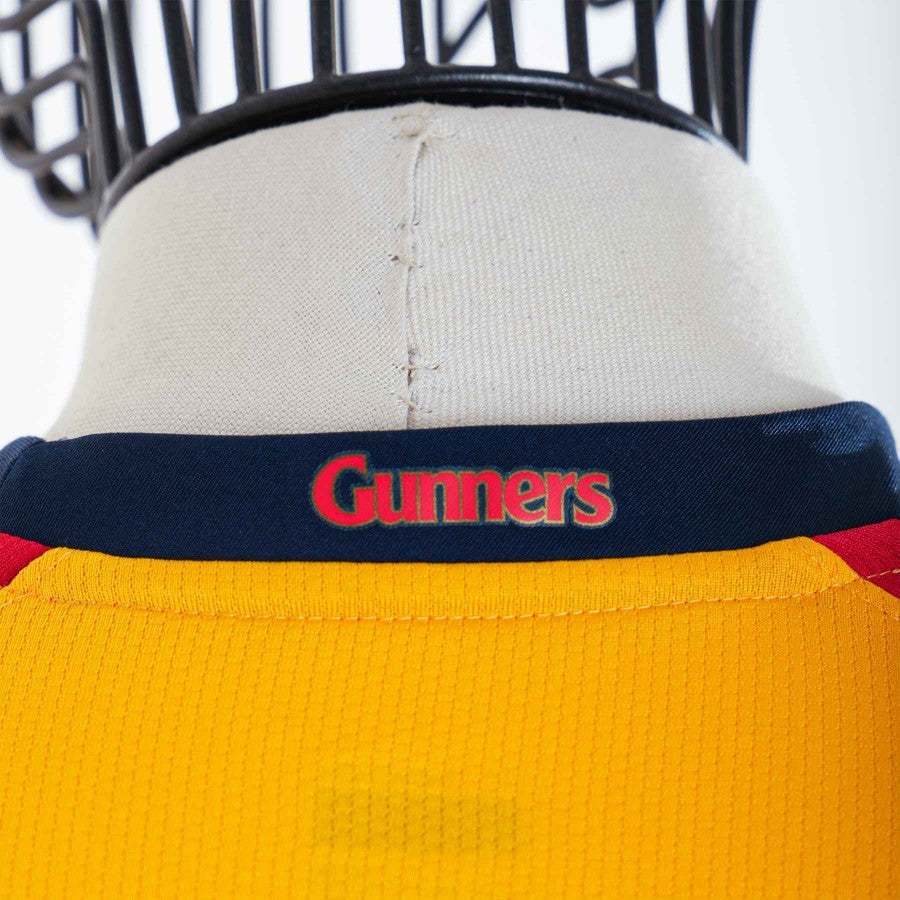 Arsenal Away model short sleeve yellow shirt with blue and red inserts. On the front is embroidered the Nike logo and is sewn the team logo, the center is printed Fly Emirates logo and on the back neck is applied the lettering GUNNERS.