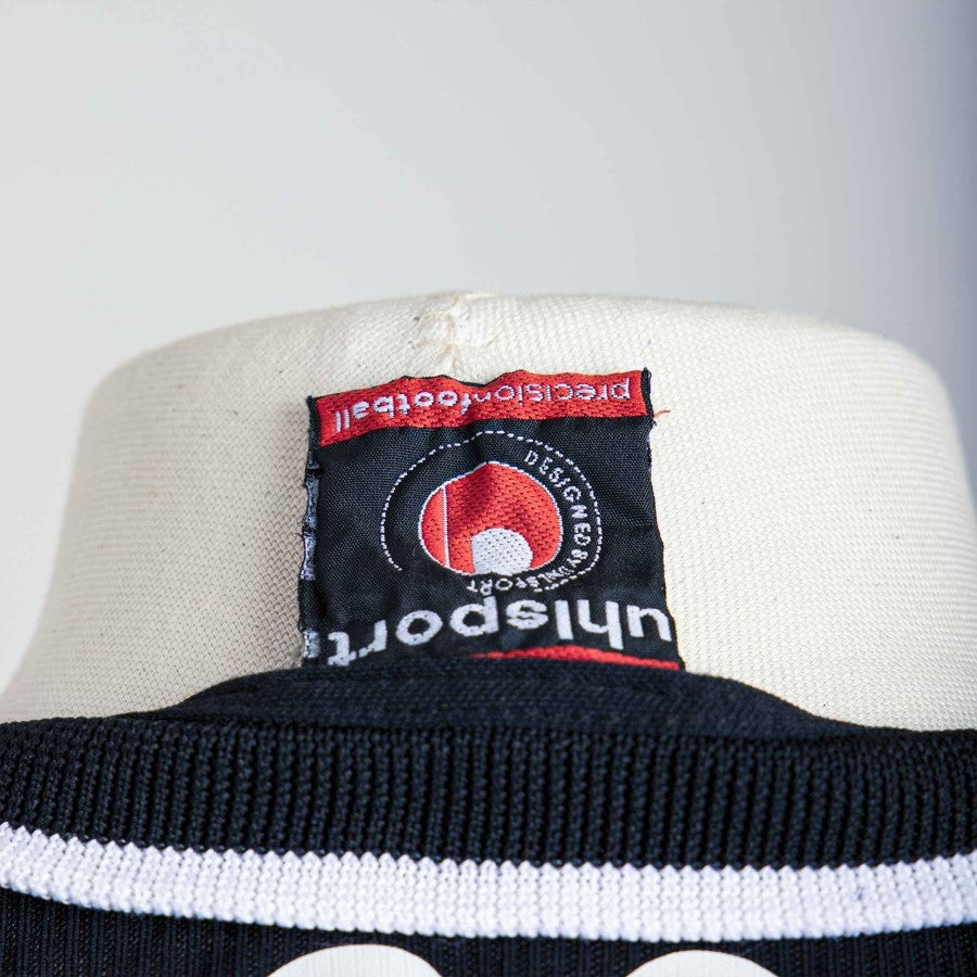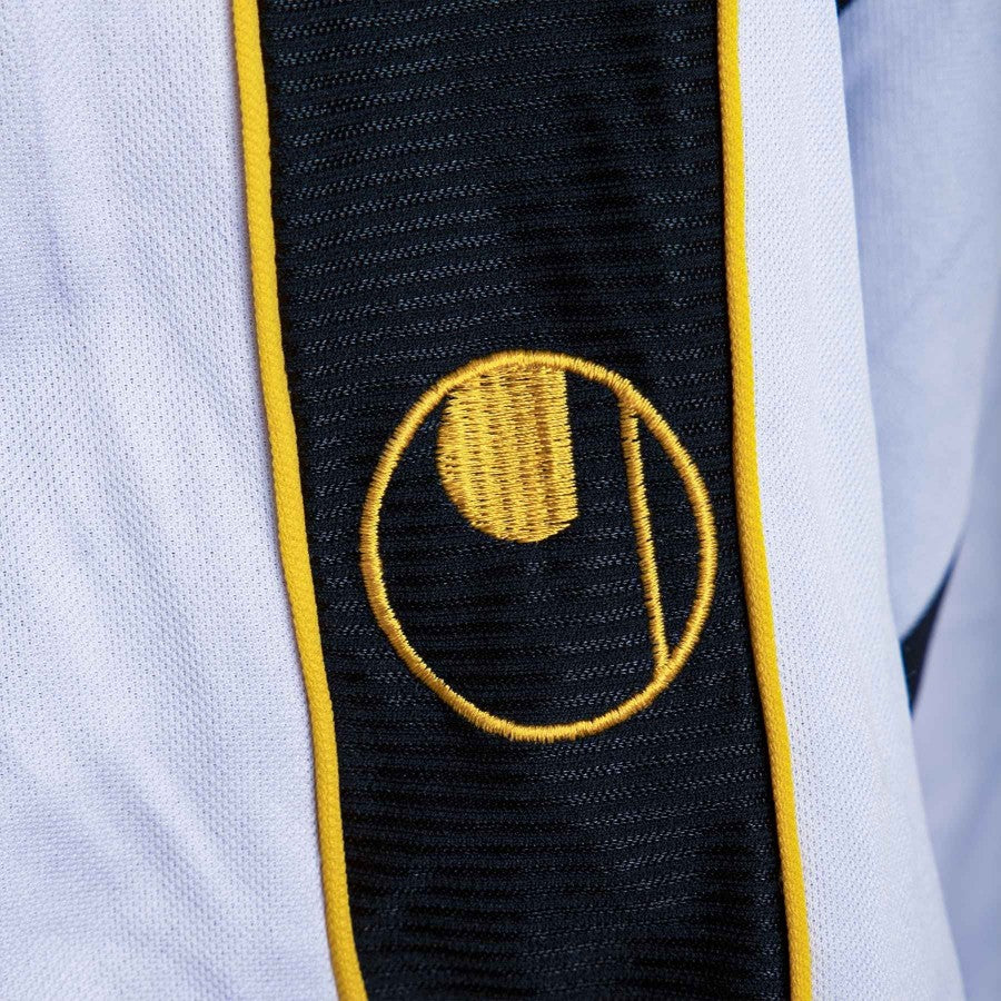 Ascoli Calcio short-sleeved shirt season 2002/2003 produced by Uhlsport. Black and white color with yellow inserts, present in the center the sublimated logo of the commercial sponsor, just above the lettering UHLSPORT embroidered. On the heart side there is the crest of Ascoli while on the left sleeve there is the Uhlsport patch. On the right sleeve there is the Lega Calcio patch and on the back TANGORRA lettering and number 5 applied.