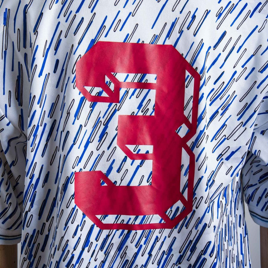 Atalanta short-sleeved shirt produced by Lotto for the 1991/1992 season. Away game uniform for away matches in white with blue inserts fantasies both on the front and back. On the chest we find the sublimated logos of Atalanta, Lotto and the commercial sponsor Tamoil. On the back the number 3 applied in red.