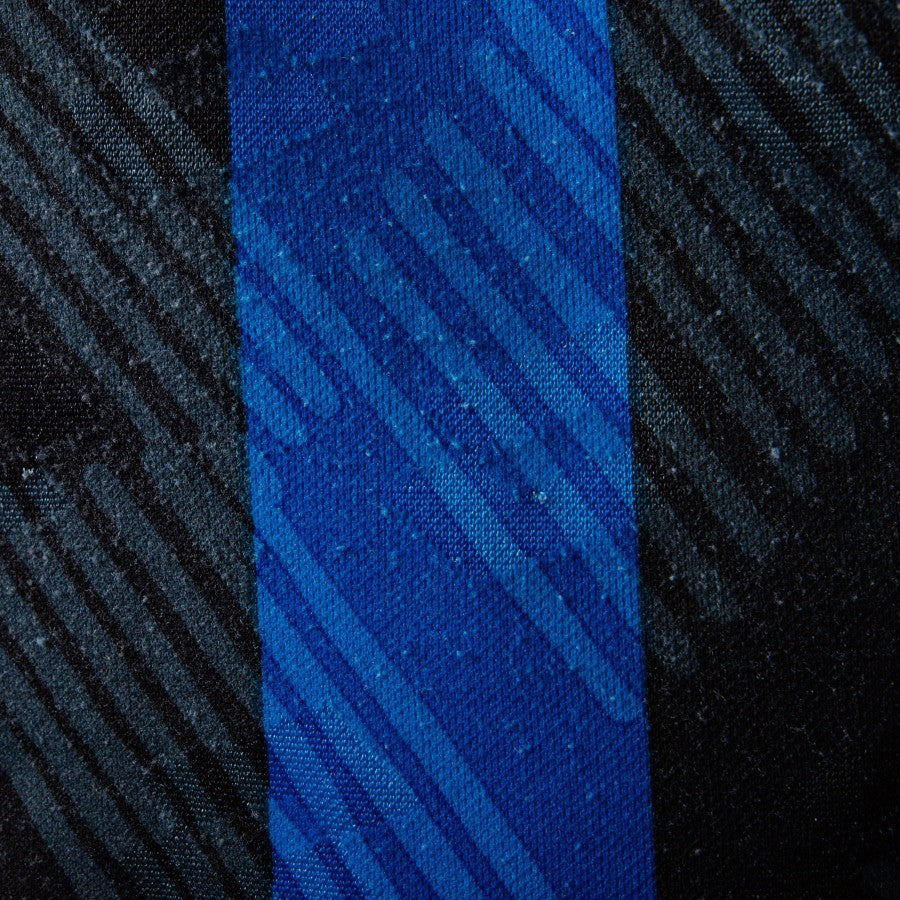 Vintage Atalanta jersey in good condition. The fabric is a bit 'felted in the lower area but is still soft to the touch. Made in the typical corporate colours of black and blue does not show discontinuity of tone. The model has long sleeves with elastic cuffs without defects. The collar has a button closure and is only sewn the small buttonhole cord. On the front heart side there is the face of the Goddess sewn in profile, the historical symbol of the club from Bergamo, with the lettering ATALANTA 1907. On the right side in sublimation lozenge and lettering technical sponsor LOTTO. In the centre sublimation main sponsor TAMOIL. On the back in flok number 4 applied. Internal label a little faded size XL.