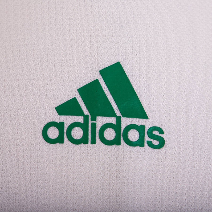 Away model of the National Football Team of Nigeria short sleeve white shirt with green inserts. On the front printed the logo of the federation, the Adidas logo and the number 9. The number 9 is printed on the back.