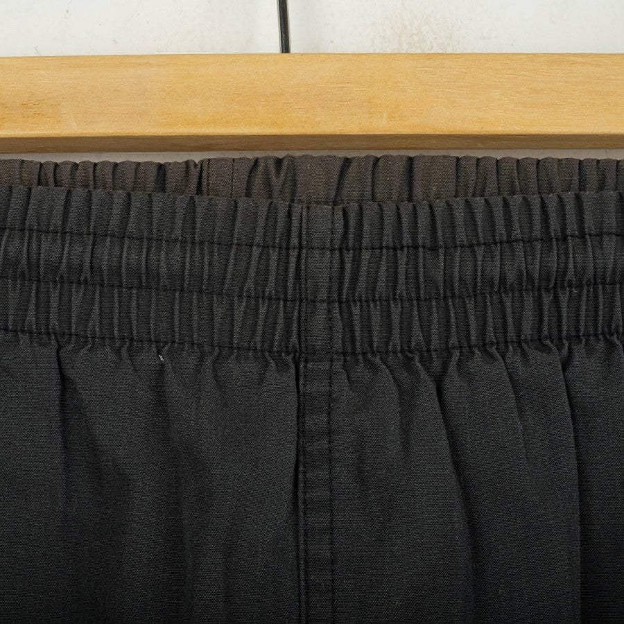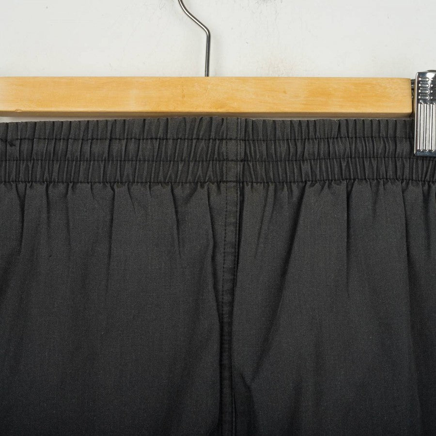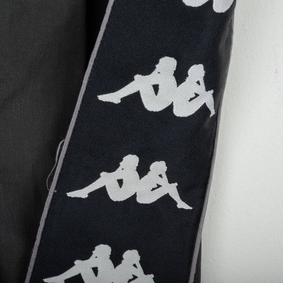 Juventus shorts produced by Kappa for the 1995/1996 season. Black design with grey side bands featuring repeated Kappa logos in jacquard. White embroidered Kappa logo on the right leg and large printed Kappa text on the left leg. Elastic waistband with adjustable drawstring. Part of the official “Gara” line, reflecting the iconic mid-90s Kappa training and leisurewear style.