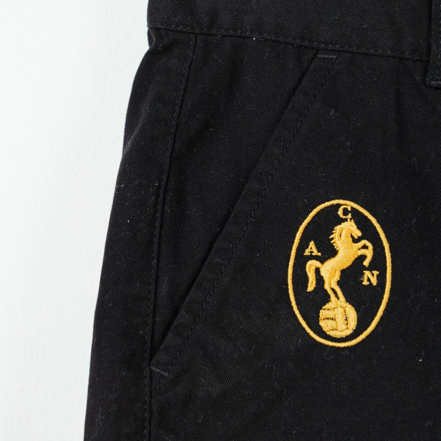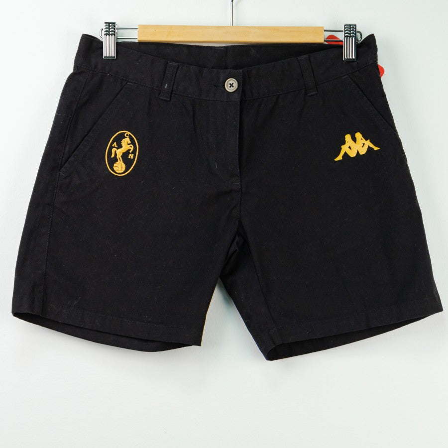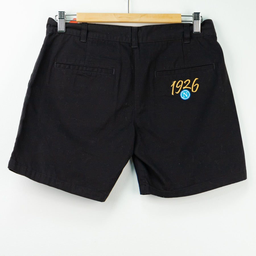 Official Napoli Bermuda shorts from the 2016/2017 season, produced by Kappa. Black model with golden details, featuring the Kappa logo on the right side and the Napoli crest on the left. The back showcases the embroidered "1926" inscription with the classic SSC Napoli blue emblem, celebrating the club's founding year. The design includes a button closure and belt loops, combining a casual and sporty style.