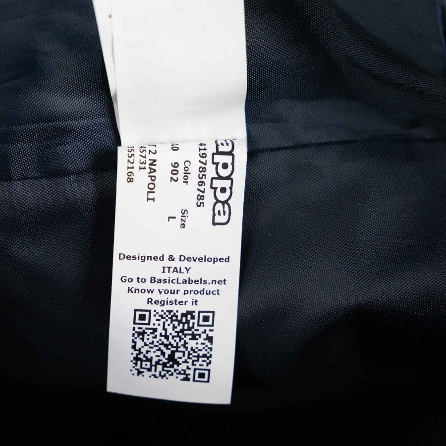 The model features a blue shoe compartment and an embroidered Napoli logo. The Kappa technical sponsor is printed in blue, while the commercial sponsors Lete, Garofalo, and Kimbo are printed in color.