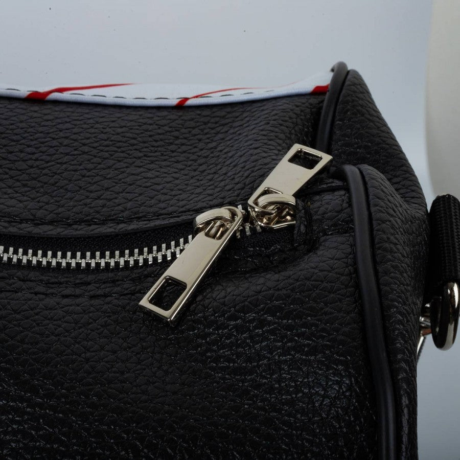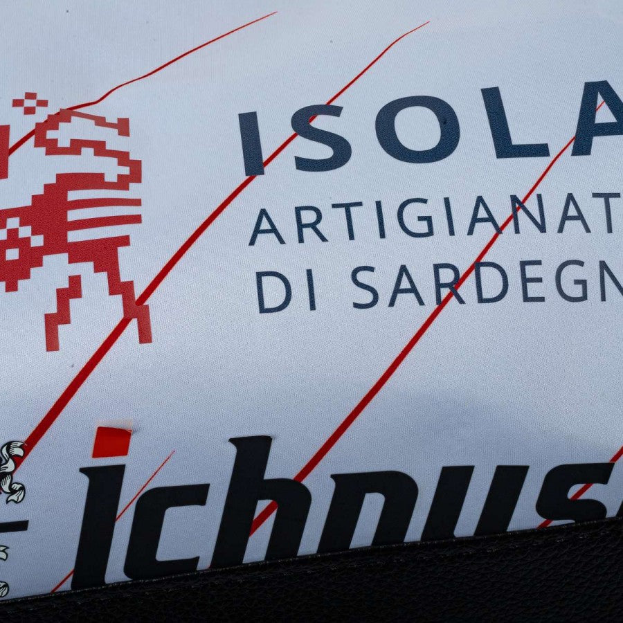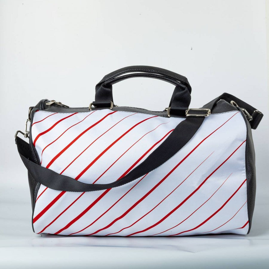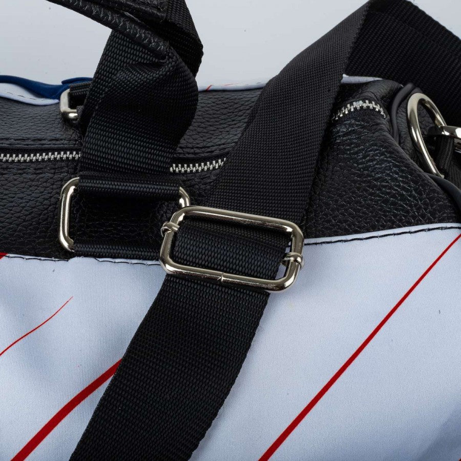 Handcrafted “Seconda Pelle” duffel bag made using the official Cagliari away shirt from the 2020/2021 season. Features the iconic white base with red diagonal stripes, stitched Adidas logo, and Cagliari club crest. Front sponsor “Isola Artigianato di Sardegna” clearly displayed. Equipped with sturdy handles, adjustable shoulder strap, and black faux leather inserts. Zipper closure and spacious interior.