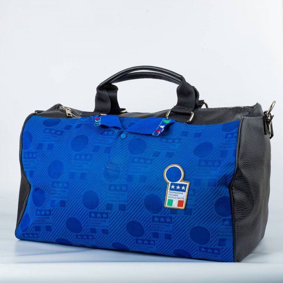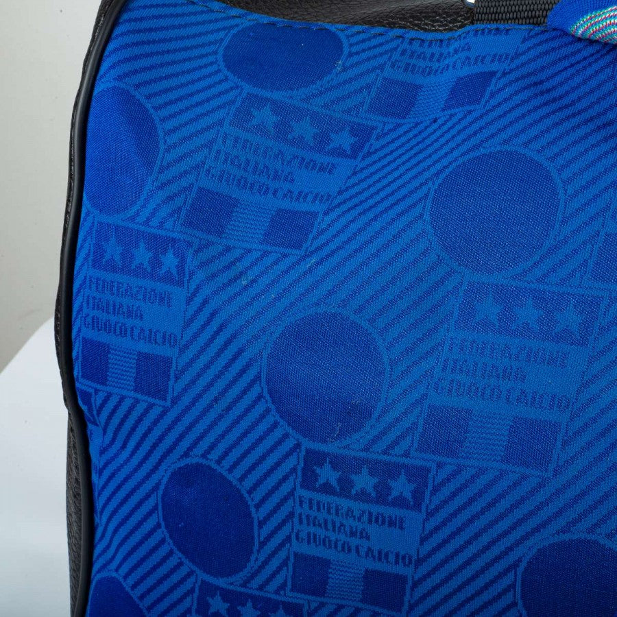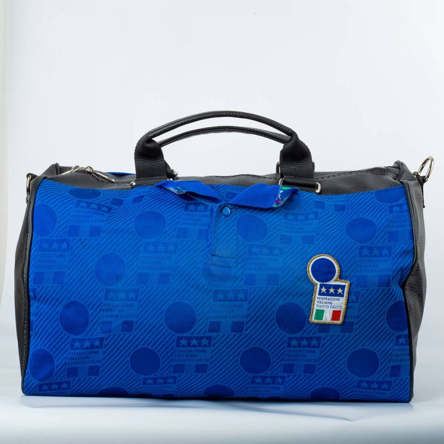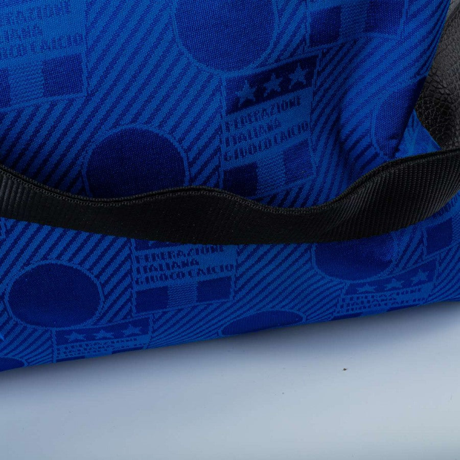 Handmade duffel bag crafted from the original Italy 1994 Diadora jersey. Iconic azzurro with jacquard pattern and tricolour collar details. Embroidered FIGC crest with three stars on the chest. Faux leather back, adjustable shoulder strap and reinforced handles. A unique, handcrafted piece made in Italy from an authentic vintage shirt.