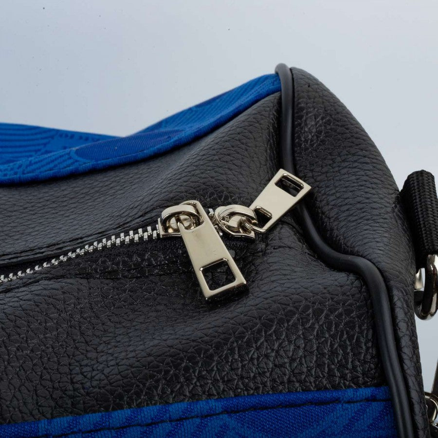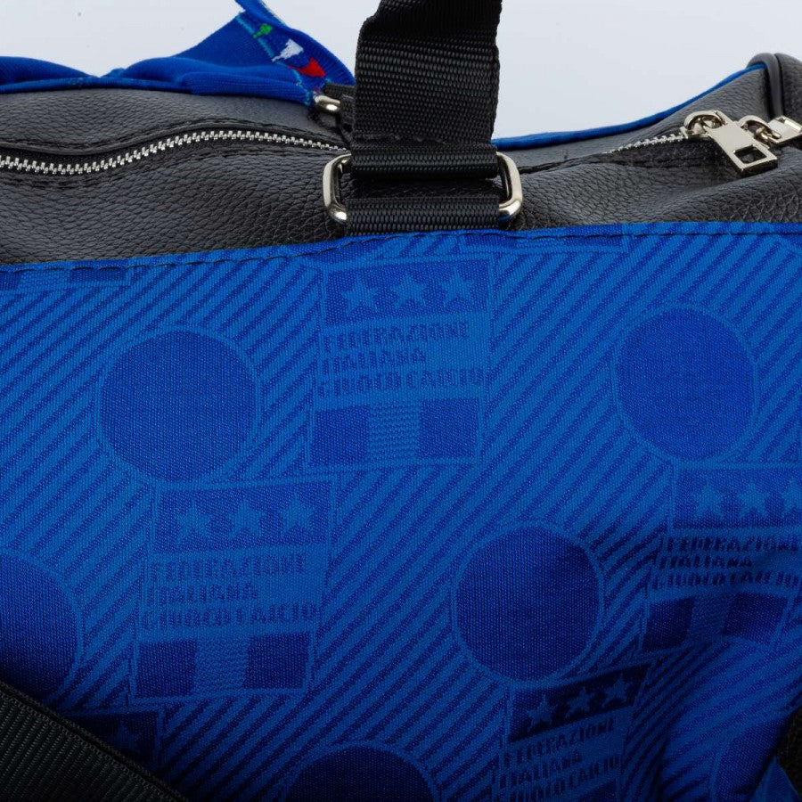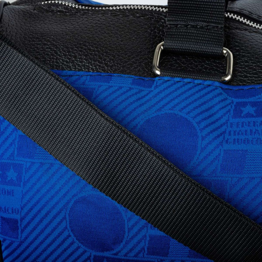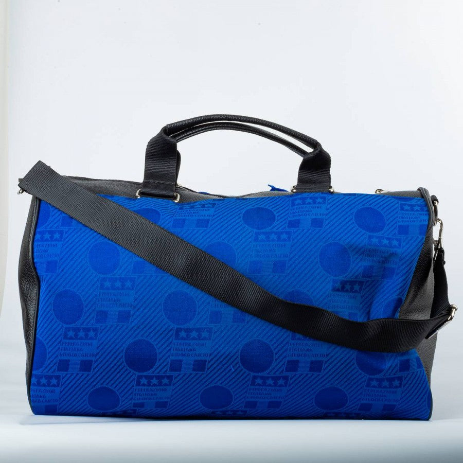 Handmade duffel bag crafted from the original Italy 1994 Diadora jersey. Iconic azzurro with jacquard pattern and tricolour collar details. Embroidered FIGC crest with three stars on the chest. Faux leather back, adjustable shoulder strap and reinforced handles. A unique, handcrafted piece made in Italy from an authentic vintage shirt.