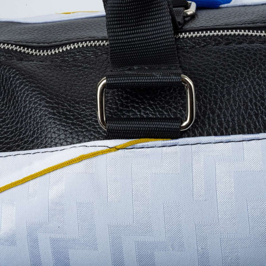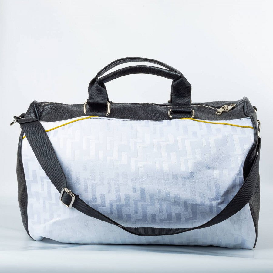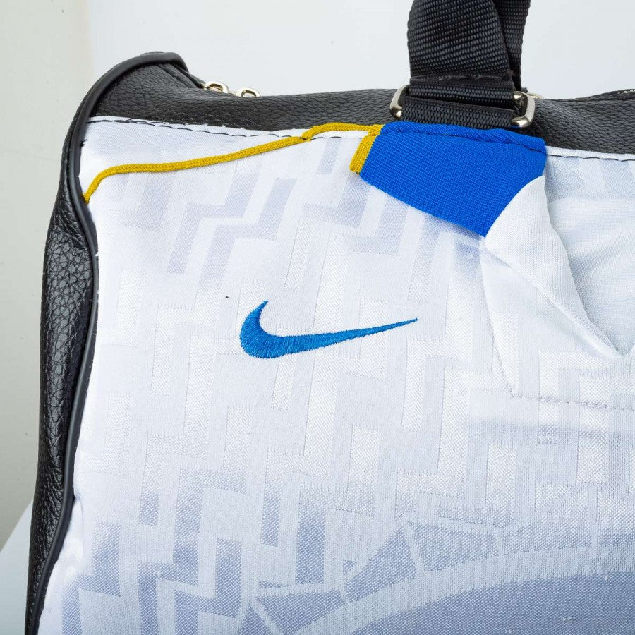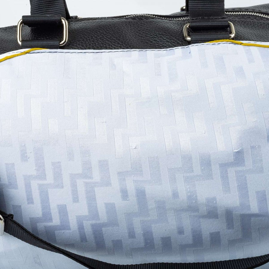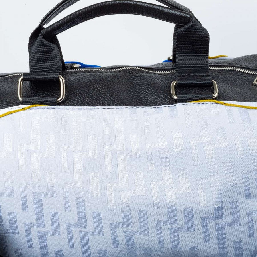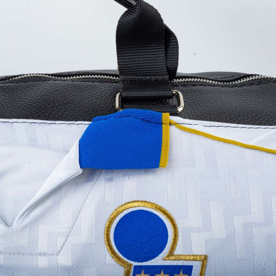Handcrafted duffel bag made using an original 1995 Italy national team shirt. Features the iconic white-on-white zig zag pattern, yellow piping, and blue details. Embroidered FIGC badge with three stars and Nike logo on the front. Rear panel in black faux leather with adjustable shoulder strap and reinforced handles. A one-of-a-kind handmade item.