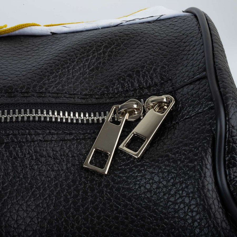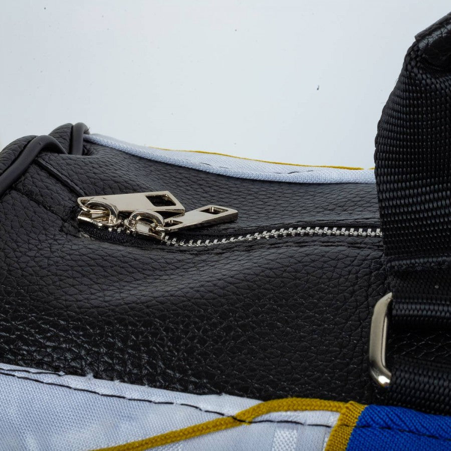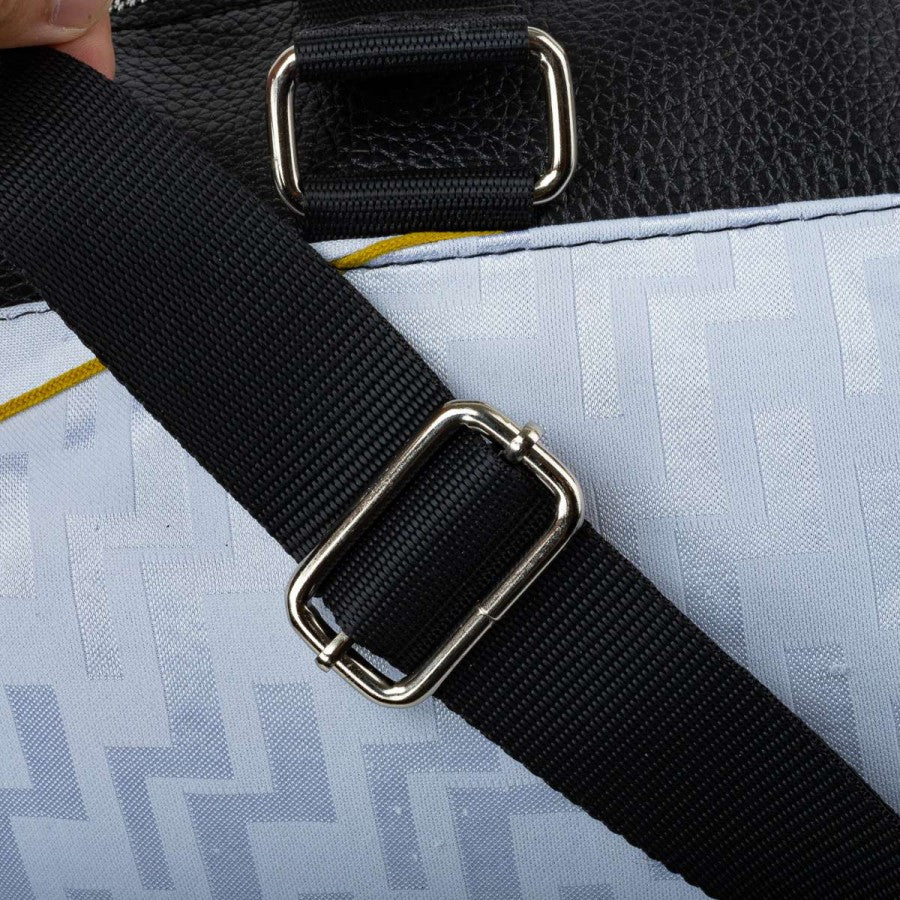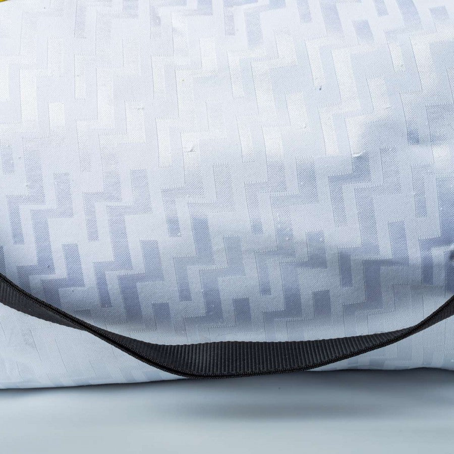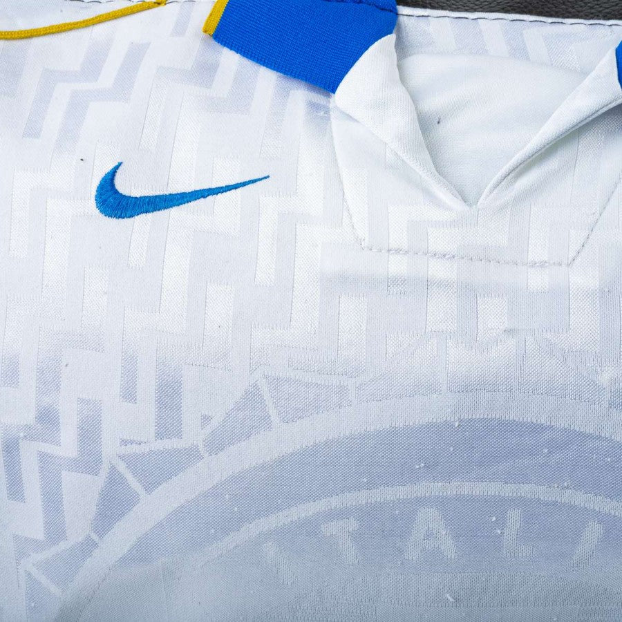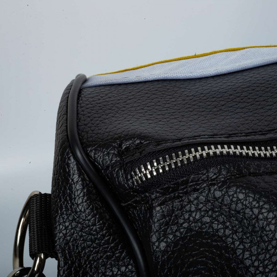 Handcrafted duffel bag made using an original 1995 Italy national team shirt. Features the iconic white-on-white zig zag pattern, yellow piping, and blue details. Embroidered FIGC badge with three stars and Nike logo on the front. Rear panel in black faux leather with adjustable shoulder strap and reinforced handles. A one-of-a-kind handmade item.
