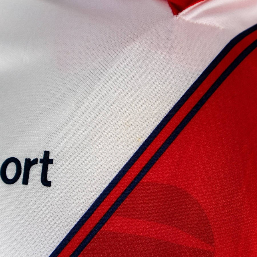 Cagliari away jersey made by UHL Sport for the early 2000s. The ribbed collar, the flock applications and the club logo are in excellent condition. Cagliari historical jersey in excellent condition.