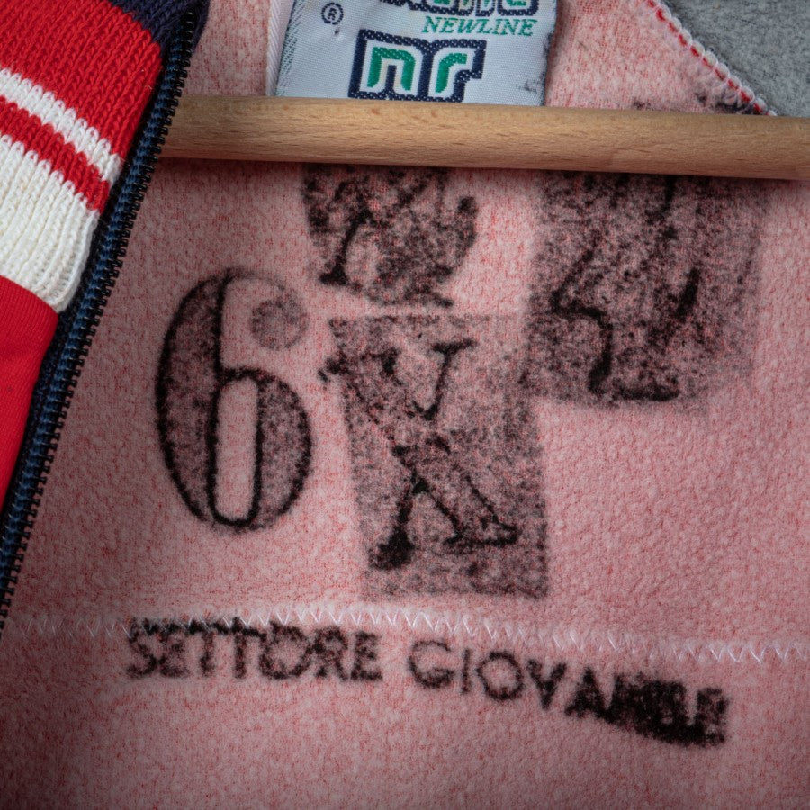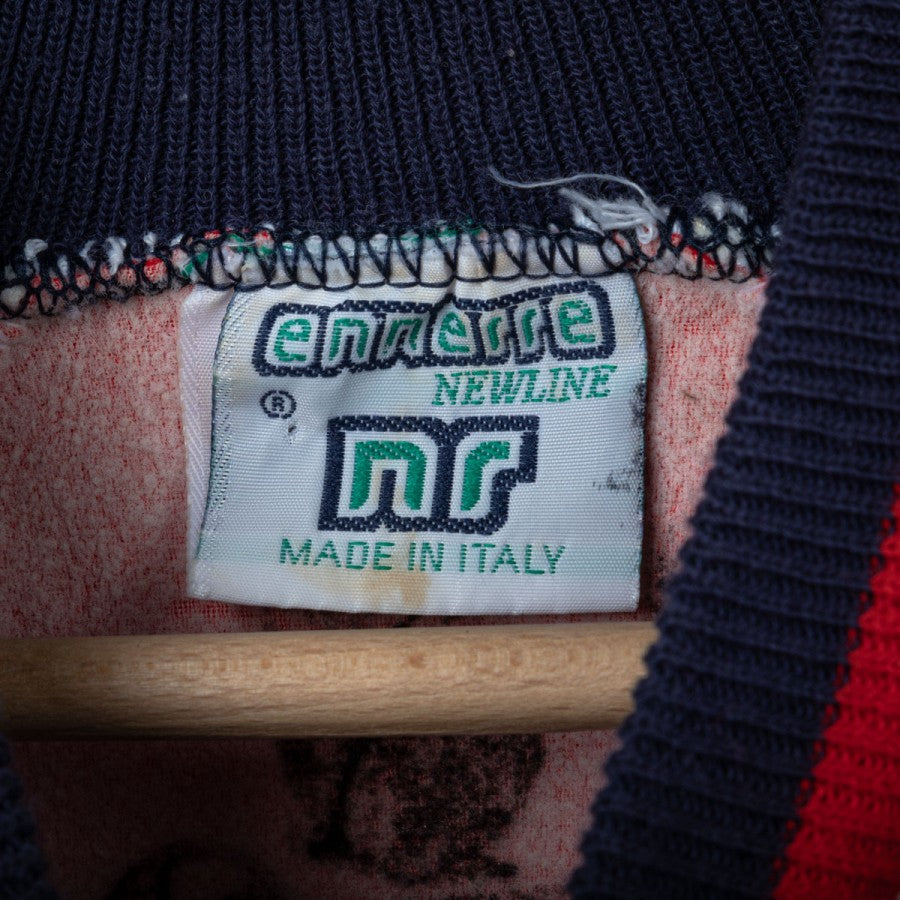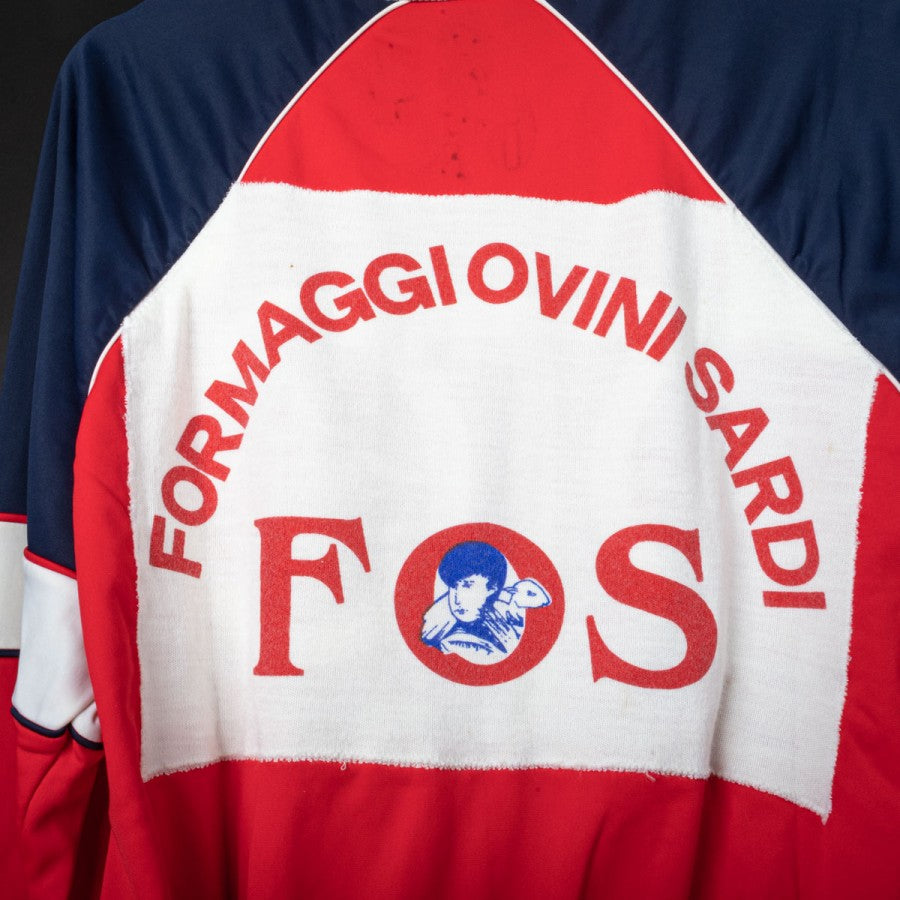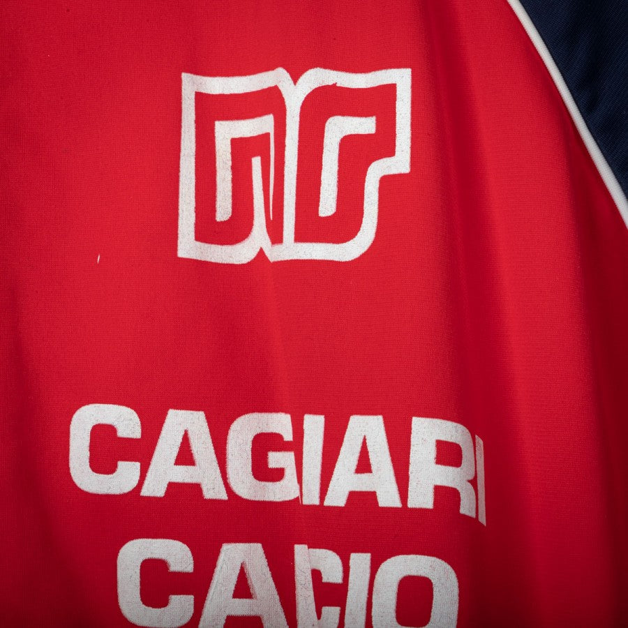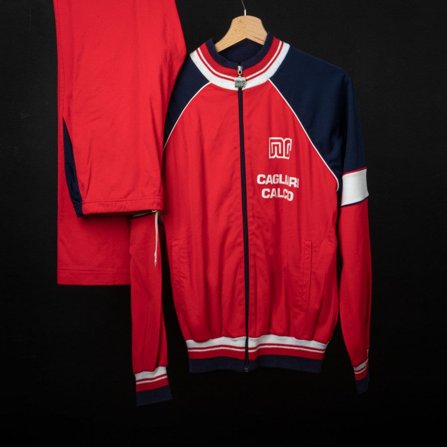 Tuta completa Cagliari prodotta dallo sponsor tecnico Ennerre nella stagione del 1984/1985. Giacca full zip colore rosso con inserti blu e bianchi. Lettering Cagliari Calcio e logo sponsor tecnico applicato in petto con serigrafia bianca.Nel retro della giacca è presente lo sponsor commerciale Formaggi Ovini Sardi. Pantaloni rossi con cordoncino. Interno giacca sono presenti stampat il numero 10 e settore giovanile. Taglia 50 (L)