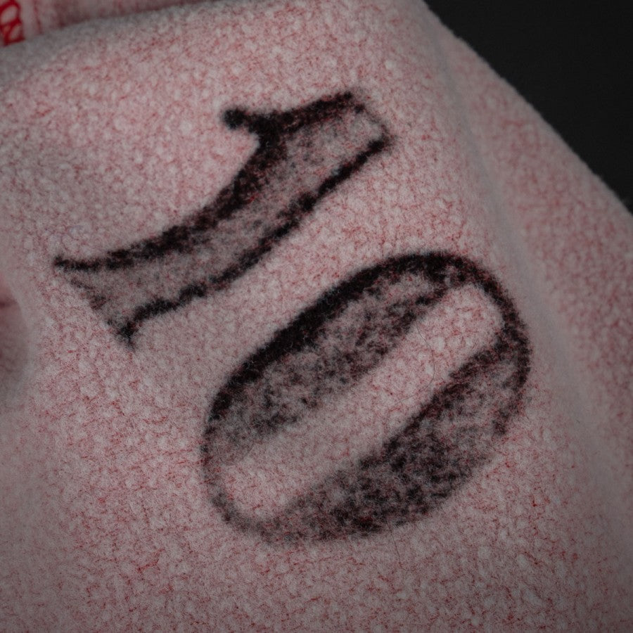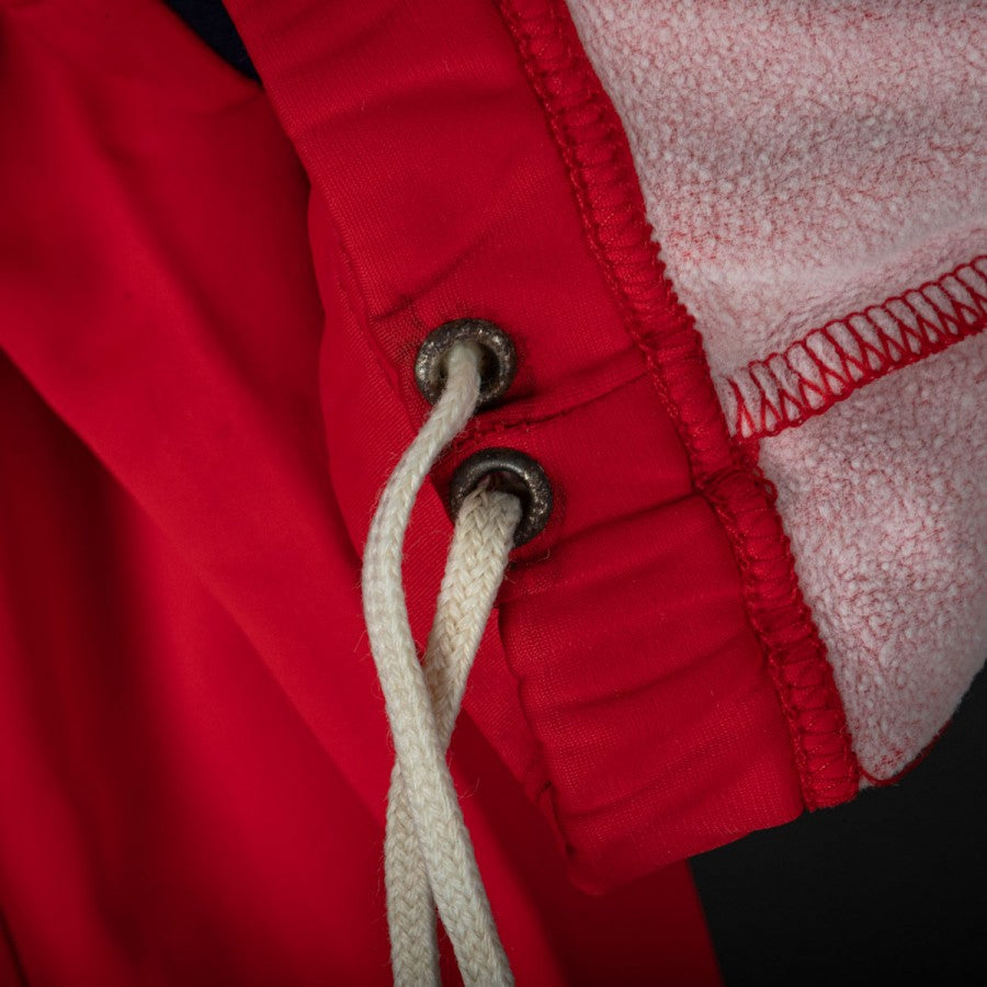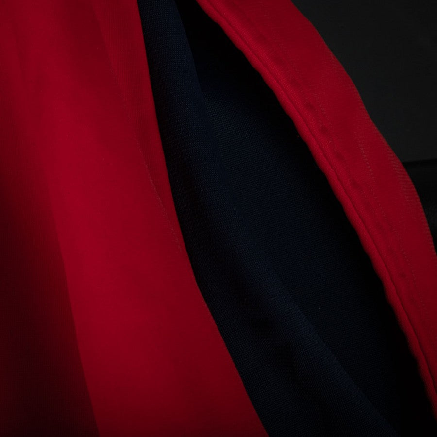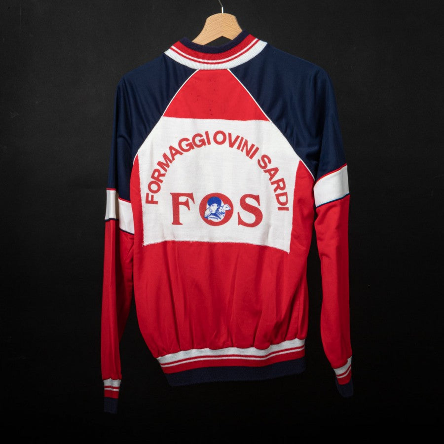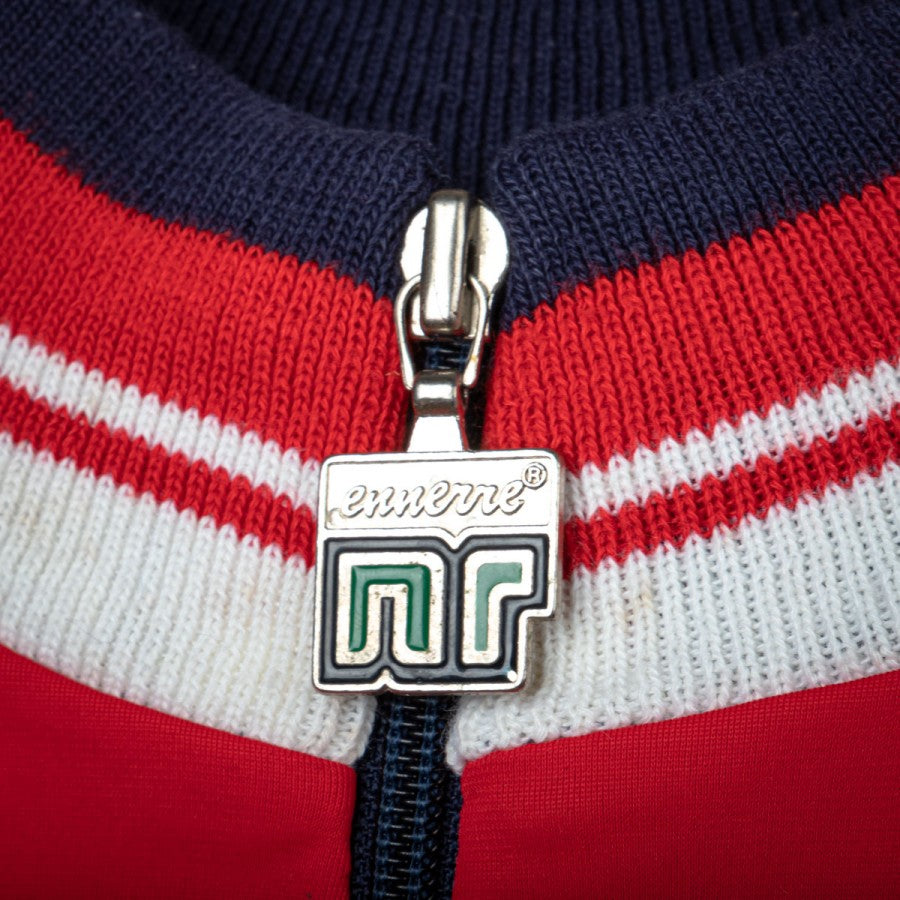 Tuta completa Cagliari prodotta dallo sponsor tecnico Ennerre nella stagione del 1984/1985. Giacca full zip colore rosso con inserti blu e bianchi. Lettering Cagliari Calcio e logo sponsor tecnico applicato in petto con serigrafia bianca.Nel retro della giacca è presente lo sponsor commerciale Formaggi Ovini Sardi. Pantaloni rossi con cordoncino. Interno giacca sono presenti stampat il numero 10 e settore giovanile. Taglia 50 (L)