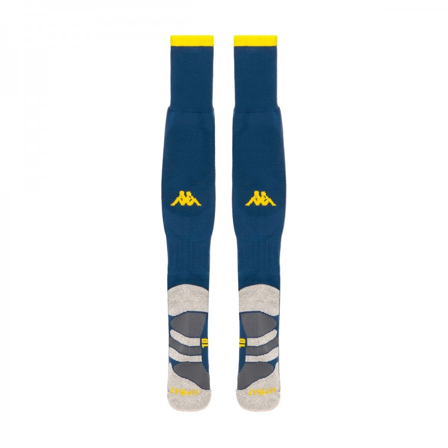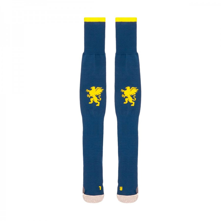Official Genoa Fourth socks made by Kappa for the 2024/2025 season. Blue with yellow top trim, Kappa logo on the front, and club crest on the back. Cushioned sole.