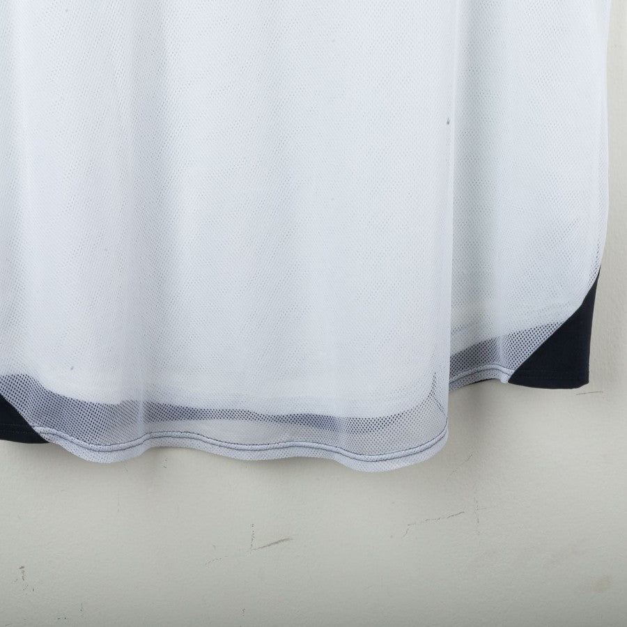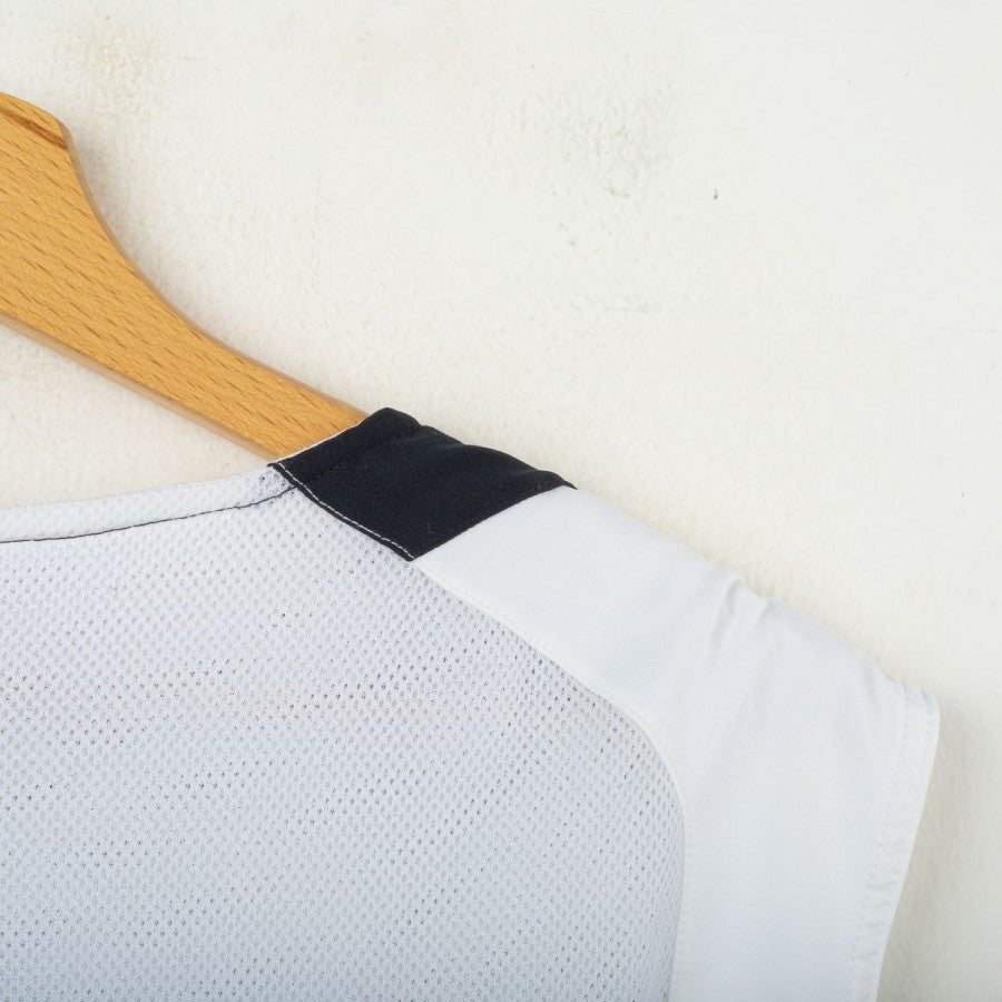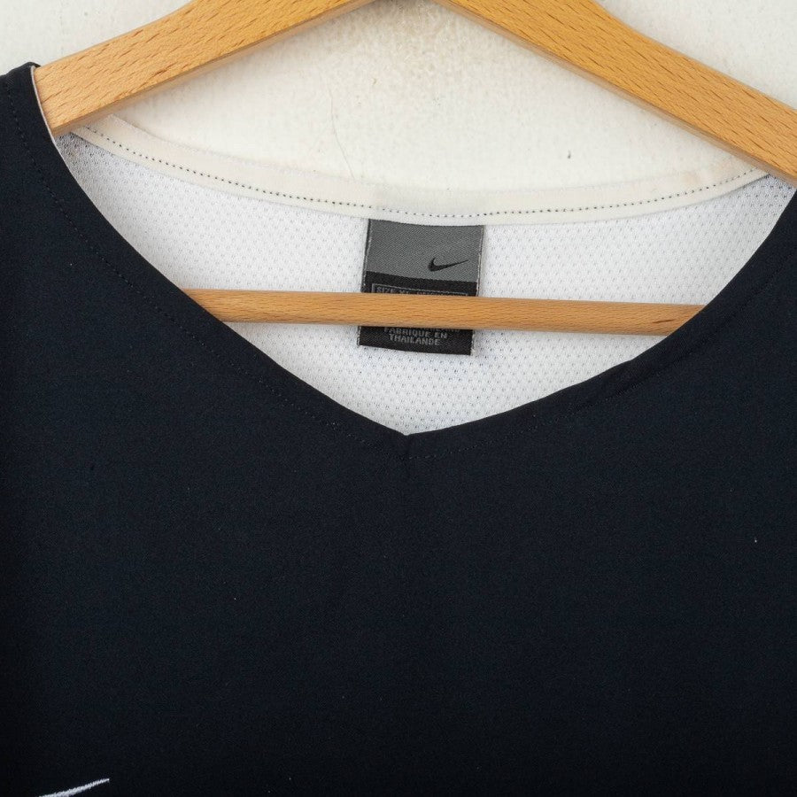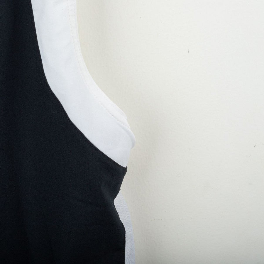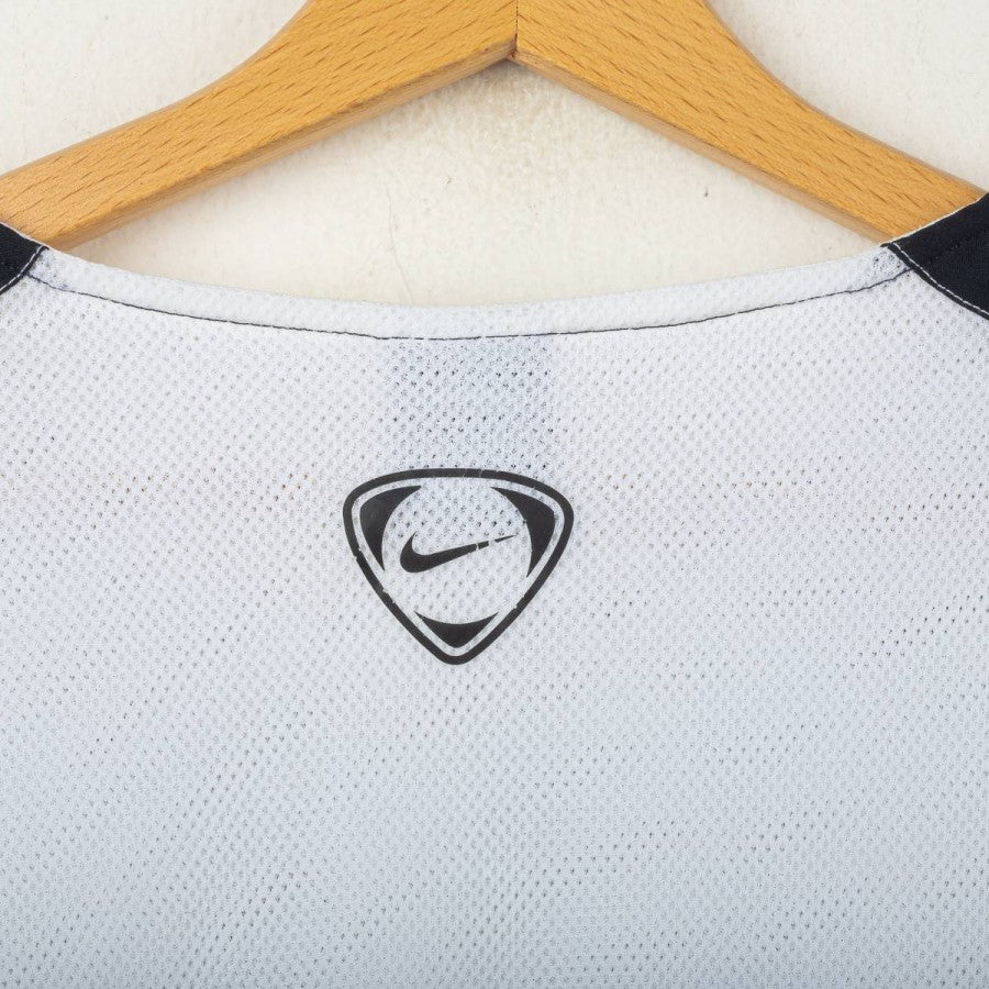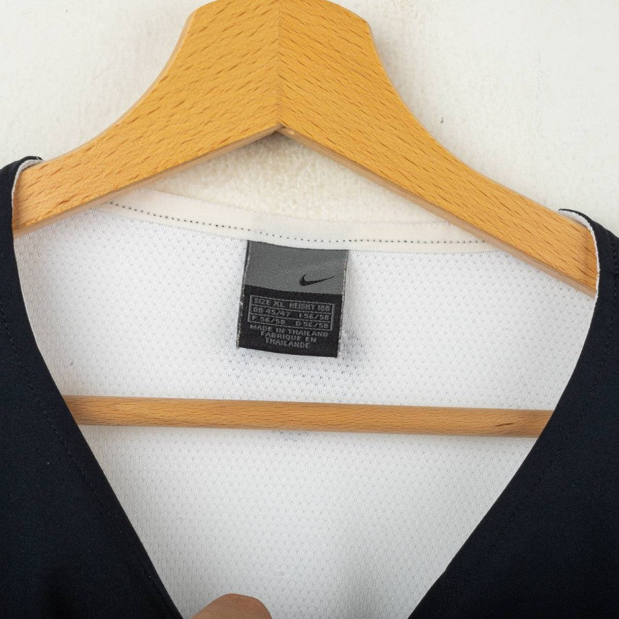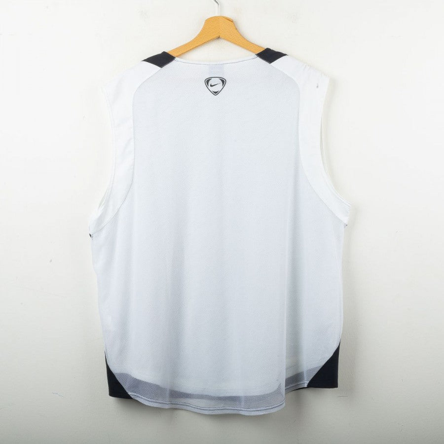 Juventus training sleeveless top from the 2003/2004 season, made by Nike. Lightweight breathable fabric, black front and white back with white side inserts. White embroidered Nike logo on the right chest, stitched Juventus crest with two embroidered stars above on the left. On the back, below the collar, black printed Nike logo inside a stylized shield. Size XXL.