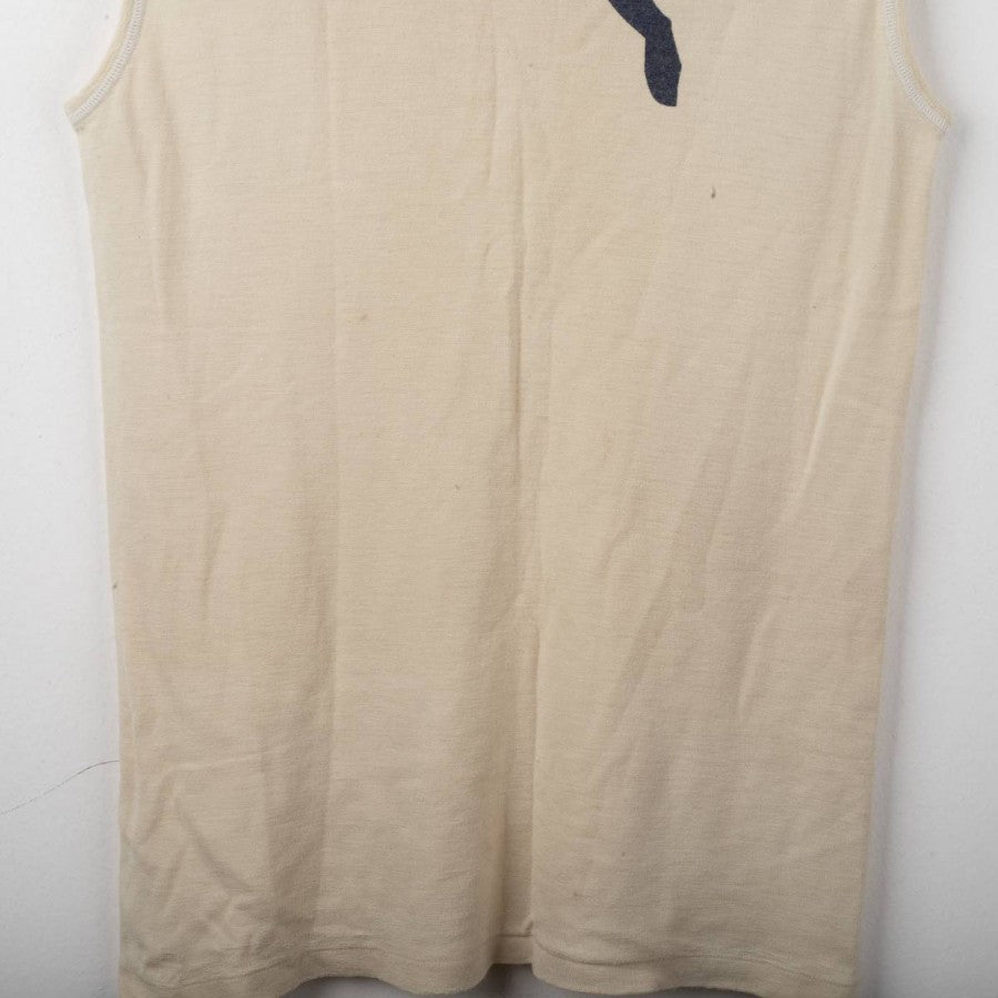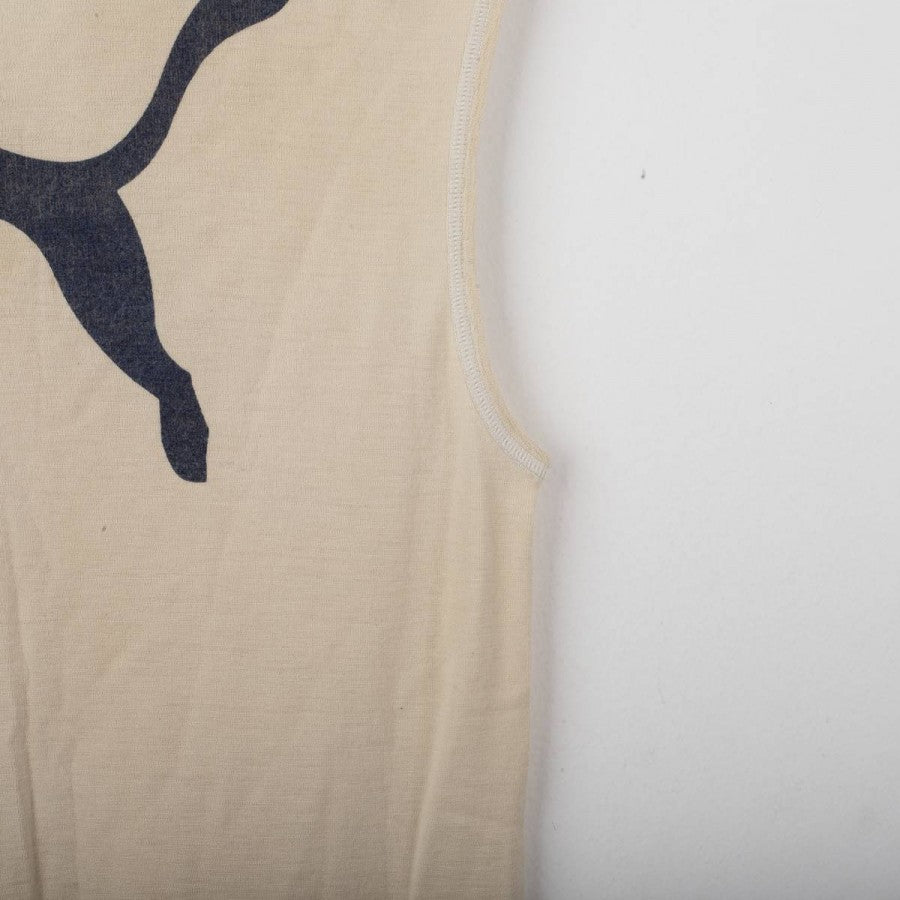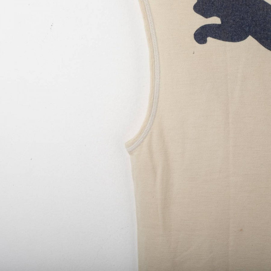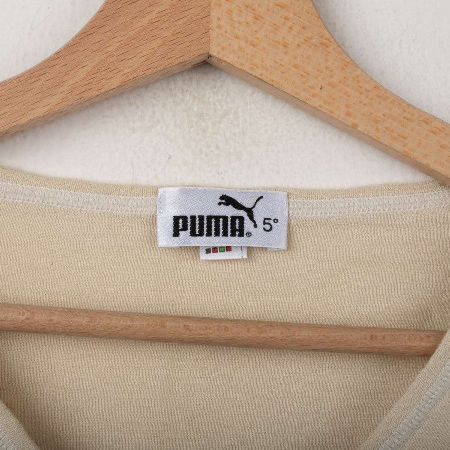 Lazio training singlet from the 1998/1999 season, made by Puma. Beige with V-neck and matching trims. Black printed Puma logo on the right chest and large Puma logo on the back. Printed Lazio crest on the left chest. Lightweight fabric designed for summer training sessions.