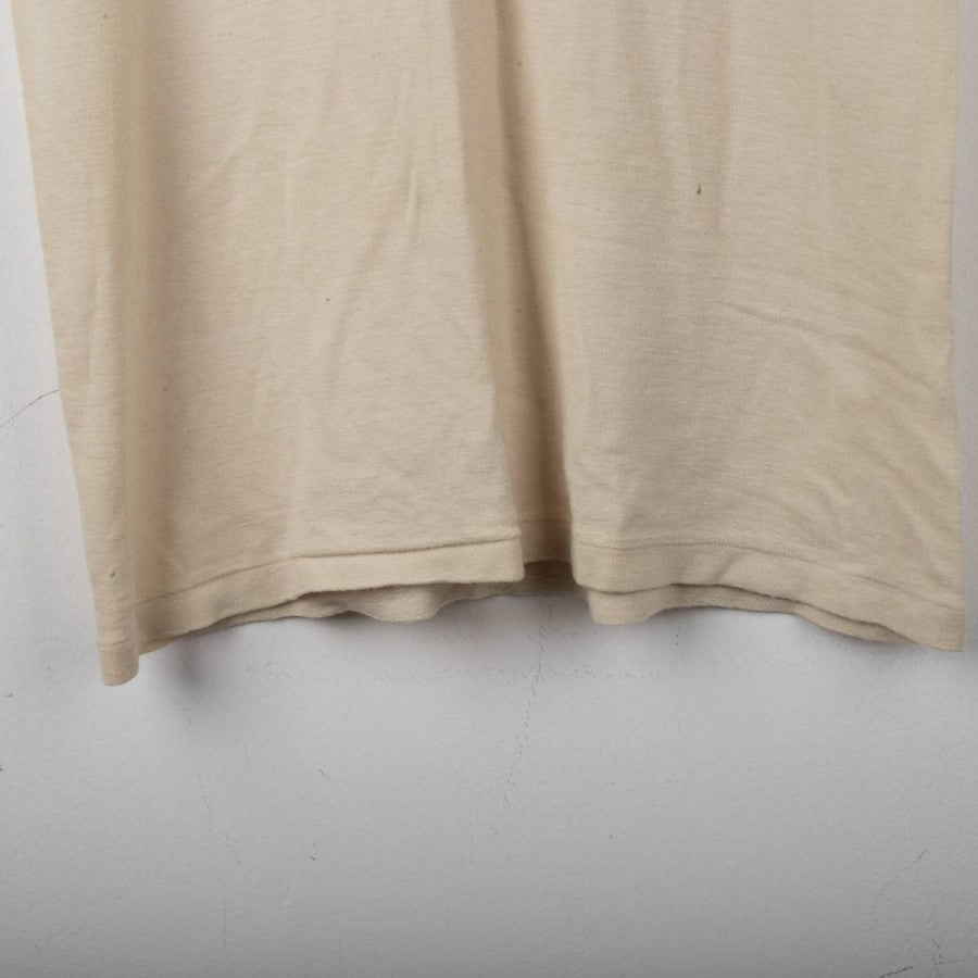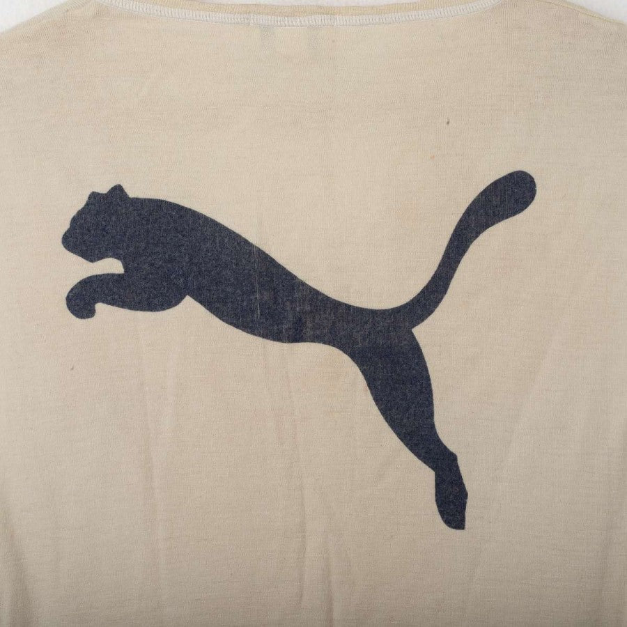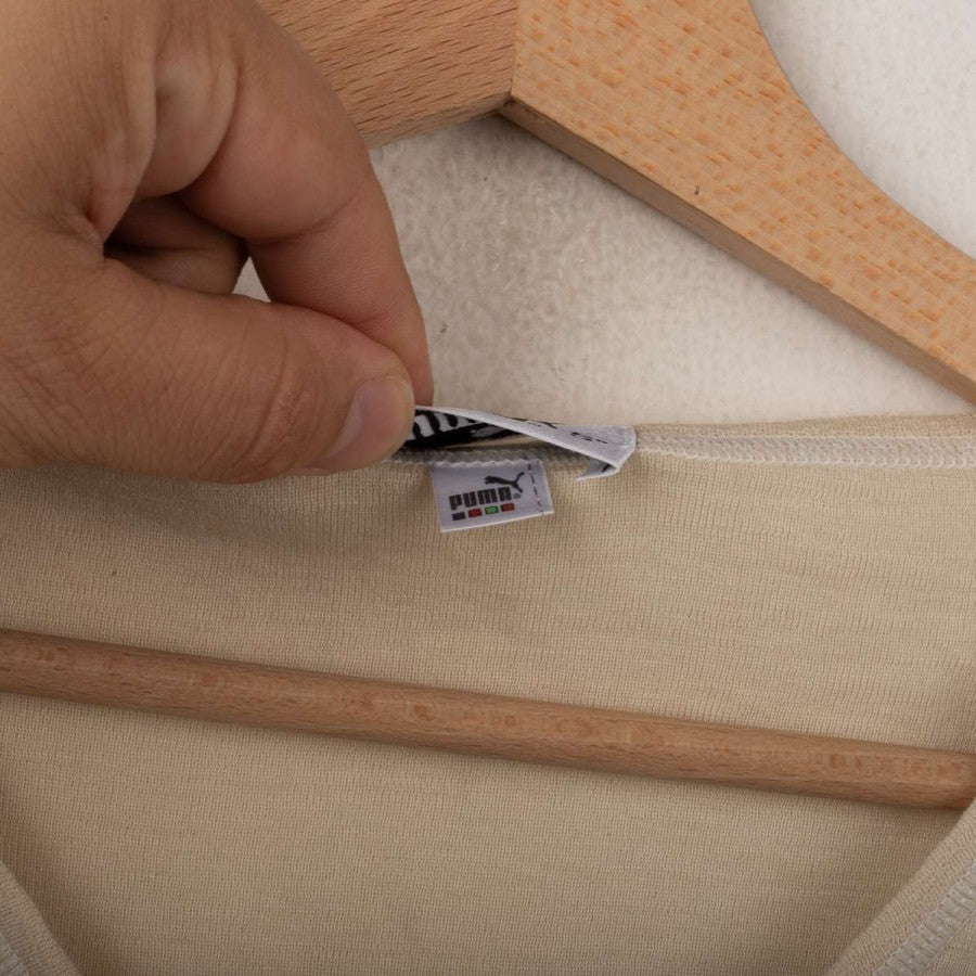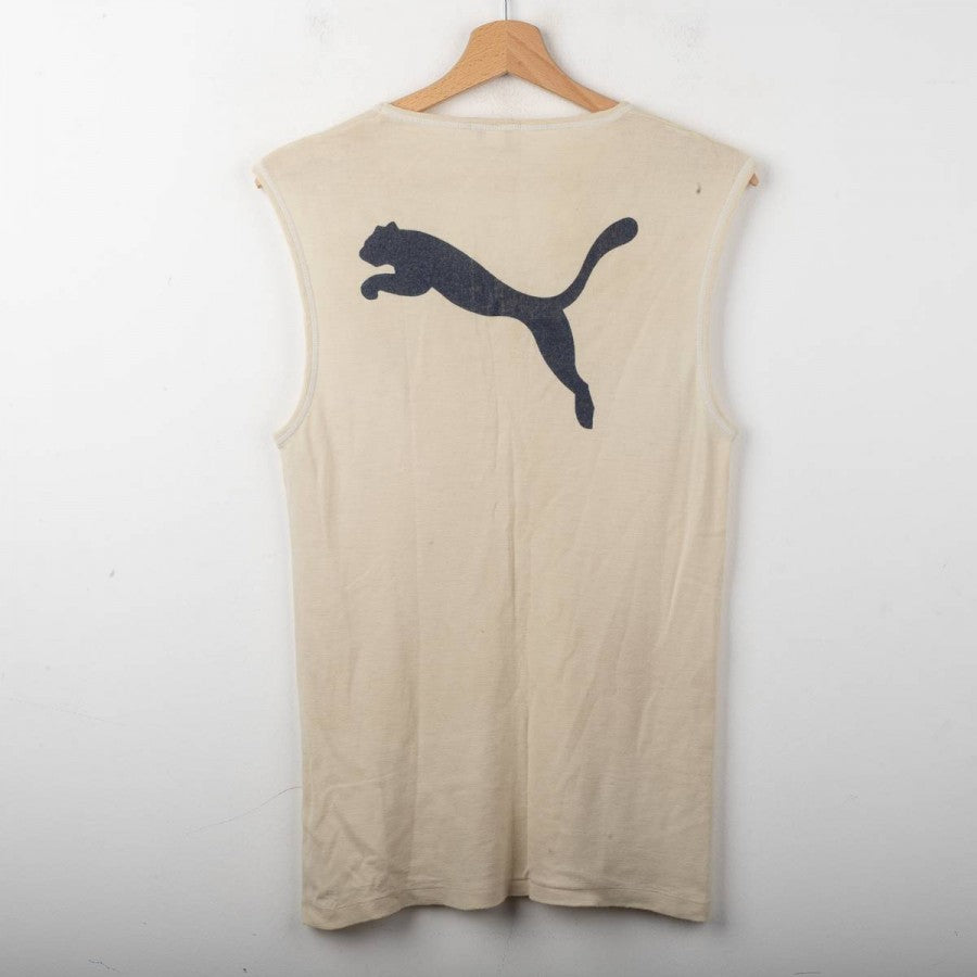 Lazio training singlet from the 1998/1999 season, made by Puma. Beige with V-neck and matching trims. Black printed Puma logo on the right chest and large Puma logo on the back. Printed Lazio crest on the left chest. Lightweight fabric designed for summer training sessions.