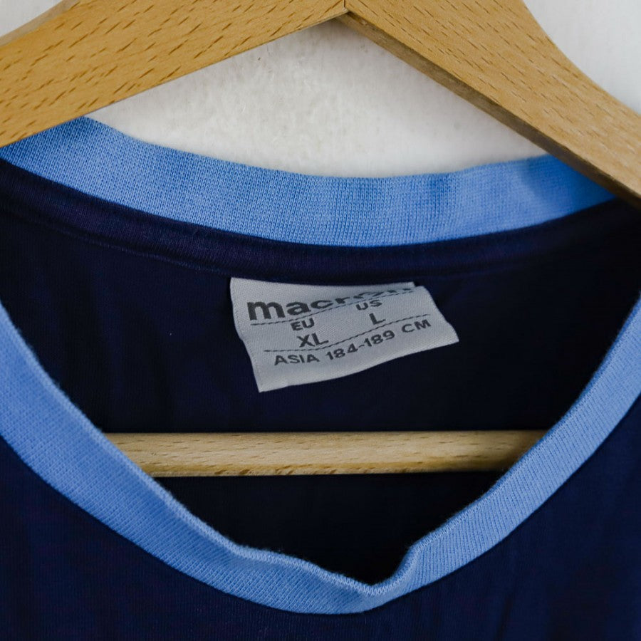 SSC Napoli Macron official training tank top from the 2013/2014 season. Navy blue with light blue collar details. Features Lete and MSC sponsors, Macron logo, and SSC Napoli crest. Number 15 printed on the front. Sponsors and SSC Napoli lettering on the back. Size XL.